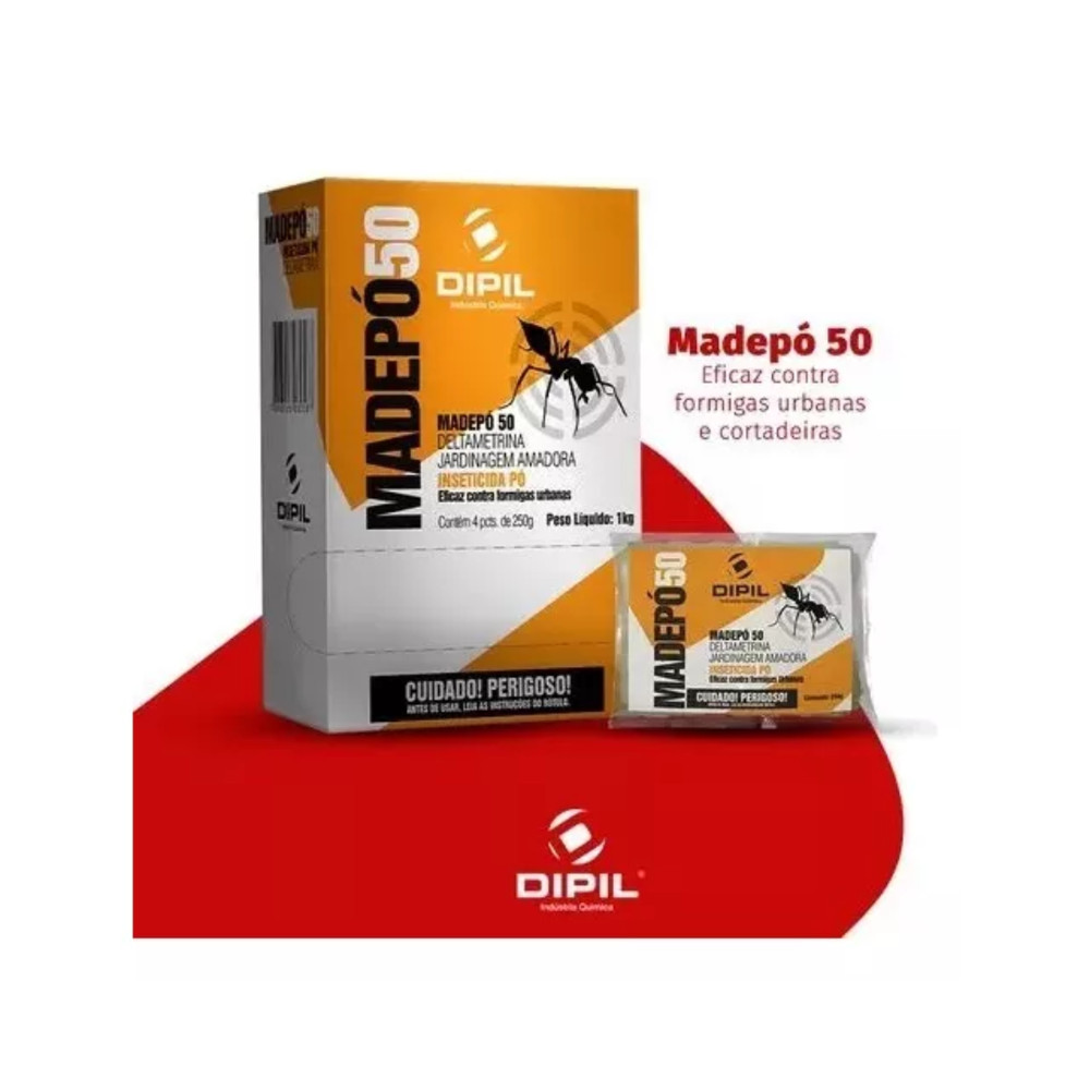 Formicida Em Pó Madepó 1kg - 4 Pctes 250g Qualquer dúvida a equipe RuralMaq está a disposição. - Foto meramente ilustrativa. - Produto novo enviado com nota fiscal. Você vai receber: Formicida Em Pó Madepó 250g Quantidade:1kg de formicida Madepó - 4 pacotes de 250g Indicação de uso: O produto Madepó50 Inseticida pó é recomendado para o combate de formigas urbanas das espécies Monomorium floricola e Solenopolis sp. Modo de Usar: Aplicar 25g/m² do produto Madepó50 Inseticida pó insuflando, com o auxílio de uma polvilhadeira manual, diretamente no formigueiro, trilhas das formigas ou nos locais onde se observa a atividade desses insetos. As formigas morrem por contato/ingestão do produto. Se necessário, reaplicar após 48 horas. Recomendações: Não aplicar em áreas externas em dias com muito vento ou chuvosos. Não aplicar próximo às nascentes e cursos dágua.