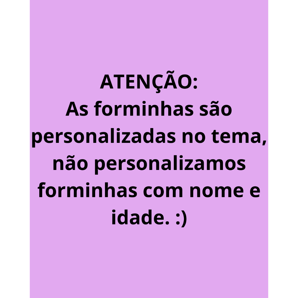******** ATENÇÃO LEIA ATENTAMENTE A DESCRIÇÃO ANTES DE EFETUAR A COMPRA ********* ESTE ANÚNCIO É PARA FORMINHAS DE DOCES PERSONALIZADAS • MEDIDAS: Largura: 3,5 cm Altura: 2,5cm Fundo: 3,5cm •FIQUE ATENTO AO PRAZO DE PRODUÇÃO. •Confeccionado em papel fotográfico 180g, impressão em qualidade alta. •SELECIONE A QUANTIDADE DESEJADA NO CARRINHO. •As forminhas são enviadas prontas para uso. • Este produto não é personalizado com NOME, pois o mesmo já está impresso apenas para fase de finalização. •As cores dos produtos podem variar de tonalidade e cor de acordo com a configuração de cada monitor, tela de celular e claridade do local onde a foto foi tirada • Verifique com atenção o prazo dado pela plataforma que inclui prazo de produção + o prazo da transportadora. Não finalize a compra caso o prazo final ultrapasse a data da sua festa. • Não encontrou o tema que deseja? Nos envie uma mensagem que desenvolveremos ele para Você! •Qualquer dúvida estamos à disposição!