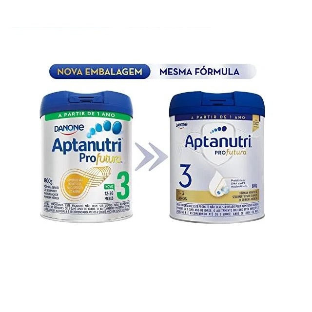 AVISO IMPORTANTE: ESTE PRODUTO NÃO DEVE SER USADO NA ALIMENTAÇÃO DE CRIANÇAS MENORES DE 1 (UM) ANO DE IDADE. O ALEITAMENTO MATERNO EVITA INFECÇÕES E ALERGIAS E FORTALECE O VÍNCULO MÃE-FILHO. Aptanutri Profutura 3 é uma formula infantil para lactentes e crianças de primeira infância (de 1 ano até a fase pré-escolar). Para que serve: Desenvolvido para as necessidades das crianças brasileiras nesta faixa etária. Contém: 2x mais absorção de DHA, Prebióticos exclusivos Danone e Rico em vitaminas A, B12, C. O MINISTÉRIO DA SAÚDE INFORMA: O ALEITAMENTO MATERNO EVITA INFECÇÕES E ALERGIAS E É RECOMENDADO ATÉ OS 2 (DOIS) ANOS DE IDADE OU MAIS.