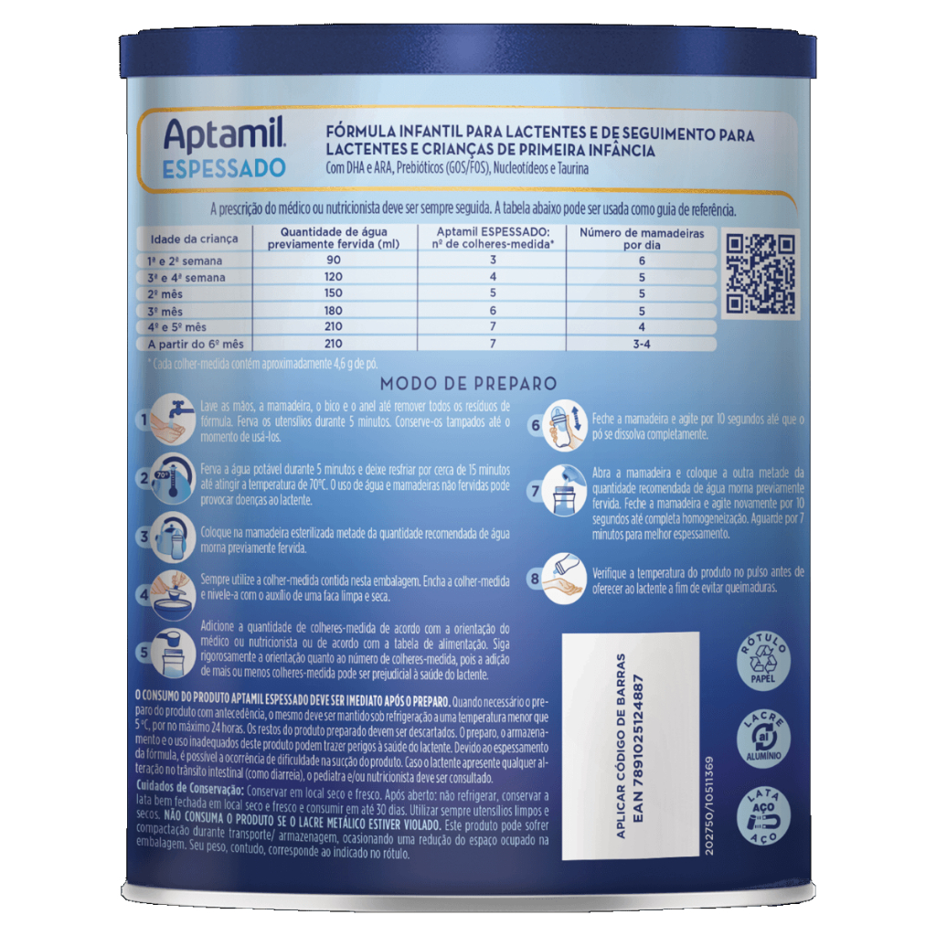 O Aptamil Espessado é uma fórmula infantil em pó indicada para lactentes e crianças de primeira infância, de 0 a 36 meses. Desenvolvido para complementar a alimentação, este suplemento contém DHA, ARA, prebióticos (GOS/FOS), nucleotídeos e taurina, importantes para o desenvolvimento saudável do bebê. Espessado com amido, é especialmente formulado para ajudar no ganho nutricional adequado e no suporte ao desenvolvimento cerebral e imunológico. A indicação deve ser sempre feita por um profissional de saúde. Sabor: Natural. Conteúdo da embalagem: 800g de fórmula infantil em pó. Fabricado por: Aptamil Composição: O Aptamil Espessado contém: Ingredientes: Lactose, óleos vegetais, amido, proteína do soro do leite, leite em pó desnatado, fibras alimentares (GOS/FOS), óleo de peixe, vitaminas e minerais essenciais, entre outros ingredientes. Informações adicionais: Contém lactose. Alérgicos: contém leite, derivados de leite, derivados de soja e de peixe. Não contém glúten. Para que é indicado o Aptamil Espessado? O Aptamil Espessado é indicado para lactentes e crianças de até 36 meses como complemento nutricional para auxiliar na nutrição, desenvolvimento cerebral e fortalecimento imunológico. Deve ser utilizado com indicação de um médico ou nutricionista, especialmente para crianças menores de 1 ano. Benefícios do Aptamil Espessado: Contém DHA e ARA para suporte ao desenvolvimento cerebral e visual Prebióticos GOS/FOS que ajudam na saúde intestinal Suplemento completo com vitaminas e minerais para crescimento saudável Espessado com amido para melhor consistência Fácil preparo e dissolução Como preparar e utilizar a Fórmula Infantil Aptamil Espessado 800g: Lave e esterilize as mãos e os utensílios antes do preparo. Ferva a água potável e deixe esfriar até cerca de 70ºC. Coloque metade da quantidade de água recomendada na mamadeira esterilizada. Use a colher-medida e adicione o pó conforme a orientação médica ou da tabela. Agite por 10 segundos, adicione a outra metade da água e agite novamente. Aguarde 7 minutos para o espessamento antes de servir. Verifique a temperatura no pulso antes de oferecer ao bebê. Advertências: Este produto não deve ser utilizado sem indicação expressa de médico ou nutricionista para crianças menores de 1 ano. O aleitamento materno é essencial e fortalece o vínculo mãe-filho. Não exceder a quantidade recomendada de pó, pois isso pode ser prejudicial. Manter fora do alcance de crianças e armazenar em local seco, fresco e inodoro.
