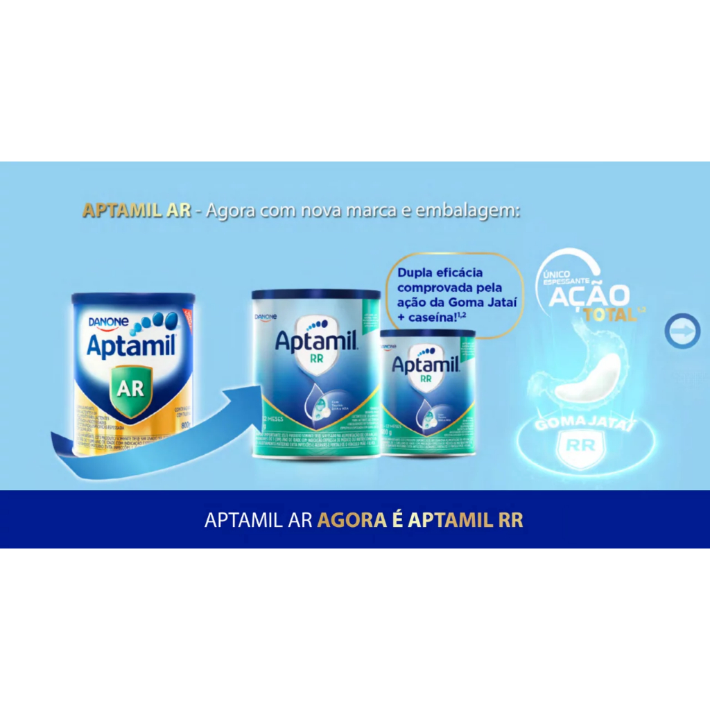 Descrição do Fórmula Infantil Aptamil RR 800g Fórmula Infantil: Aptamil RR 800g - 0-12 meses Aptamil RR é uma fórmula infantil para lactentes de 0 a 12 meses de vida, destinada a necessidades dietoterápicas específicas espessada com goma jataí, contém DHA, ARA e Taurina. Características: Fórmula infantil para lactentes de 0 a 12 meses - Espessada com goma jataí - DHA e ARA - Taurina - Consulte seu médico pediatra e/ou nutricionista 1. O leite materno é o melhor alimento para os lactentes. ESTE PRODUTO SOMENTE DEVE SER USADO NA ALIMENTAÇÃO DE CRIANÇAS MENORES DE 1 (UM) ANO DE IDADE COM INDICAÇÃO EXPRESSA DE MÉDICO OU NUTRICIONISTA. O ALEITAMENTO MATERNO EVITA INFECÇÕES E ALERGIAS E FORTALECE O VÍNCULO MÃE-FILHO O PRODUTO MENCIONADO NÃO CONTÉM GLÚTEN.Consulte sempre seu médico e/ou nutricionista. Como preparar e utilizar o Fórmula Infantil Aptamil RR 800g 1. Lave as mãos, a mamadeira, o bico e o anel até remover todos os resíduos de fórmula. Ferva os utensílios durante 5 minutos e conserve-os tampados até o momento de usá-los. 2. Ferva água potável durante 5 minutos e deixe resfriar por cerca de 15 minutos até atingir a temperatura de 70°C. O uso de água e mamadeiras não fervidas pode provocar doenças à criança. 3. Coloque na mamadeira esterilizada a quantidade exata de água previamente fervida. 4. Sempre utilize a colher-medida contida nesta embalagem. Encha a colher-medida e nivele-a com o auxílio de uma faca limpa e seca. 5. Adicione a quantidade de colheres-medida de acordo com a orientação do médico ou nutricionista ou de acordo com a tabela de alimentação. Siga rigorosamente o número de colheres-medida, pois a adição de mais ou menos colheres-medida pode ser prejudicial à saúde da criança. 6. Feche a mamadeira e agite-a até que o pó se dissolva completamente. Mexa ou agite a fórmula antes de oferecer à criança. 7. Verifique a temperatura do produto no pulso antes de oferecer à criança a fim de evitar queimaduras. 8. O CONSUMO DO PRODUTO APTAMIL RR DEVE SER IMEDIATO APÓS O PREPARO. Quando necessário o preparo do produto com antecedência, o mesmo deve ser mantido sob refrigeração a uma temperatura menor que 5ºC, por no máximo 24 horas. 9. Os restos do produto preparado devem ser descartados. 10. O preparo, o armazenamento e o uso inadequados deste produto podem trazer perigos à saúde do lactente. Ingredientes do Fórmula Infantil Aptamil RR 800g Lactose, leite em pó desnatado*, óleos vegetais (óleo de canola, óleo de palma, óleo de girassol alto oleico, óleo de girassol), goma jataí, maltodextrina, óleo de peixe, carbonato de cálcio, L-cistina, óleo de Mortierella alpina, L-ascorbato de sódio, cloreto de colina, ácido L-ascórbico, taurina, caseinato de cálcio, sulfato ferroso, L-triptofano, inositol, palmitato de ascorbila, proteína do soro de leite*, sulfato de zinco, fosfato de potássio dibásico, nicotinamida, D-pantotenato de cálcio, acetato de retinila, gluconato cúprico, palmitato de retinila, acetato de DL-alfa-tocoferila, DL-alfa-tocoferol, cloridrato de cloreto de tiamina, riboflavina, cloridrato de piridoxina, ácido N-pteroil-L-glutâmico, iodato de potássio, sulfato de manganês (II), fitomenadiona, selenito de sódio, colecalciferol, D-biotina, cianocobalamina, emulsificante lecitina de soja e mono e diglicerídeos de ácidos graxos, antioxidante mistura concentrada de tocoferois e regulador de acidez ácido cítrico. CONTÉM LACTOSE. NÃO CONTÉM GLÚTEN. ALÉRGICOS: CONTÉM LEITE E DERIVADOS DE LEITE, DE SOJA E DE PEIXE.