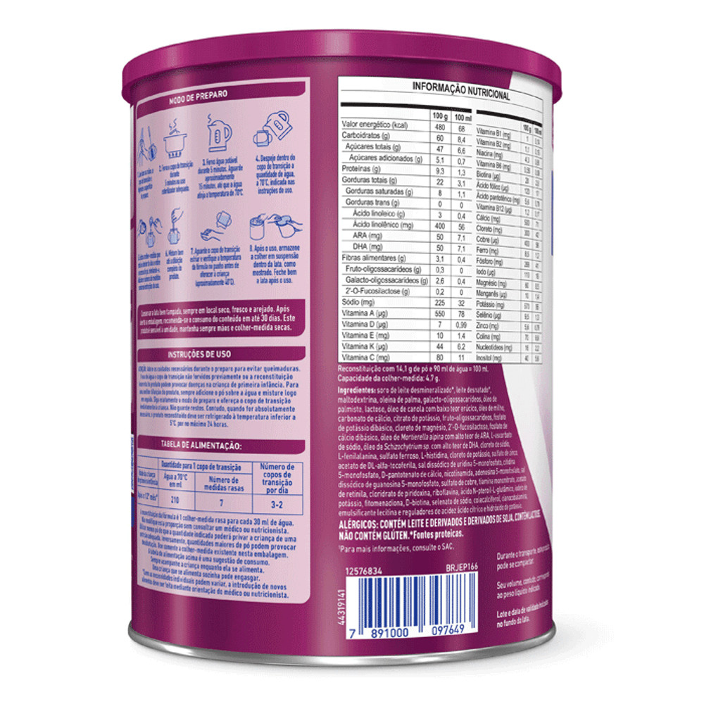 NAN Comfor 2 é uma fórmula infantil para lactentes, desenvolvido pela Nestlé que contém prebióticos, DHA, ARA e Nucleotídeos. Apresenta baixo teor de sódio, além de ser sem açúcar, glúten e aromatizantes. Seu uso é indicado para suprir as necessidades nutricionais de lactentes de 6 a 12 meses. Possui um mix de gorduras que inclui os ácidos graxos essenciais, além de vitaminas e minerais. Como preparar a Fórmula Infantil Nestlé NAN Comfor 2? Lave bem as mãos, a mamadeira, o bico e o anel e higienize a superfície de preparo. Ferva a mamadeira, o bico e o anel durante 5 minutos ou use esterilizador adequado. Ferva água potável durante 5 minutos. Aguarde aproximadamente 15 minutos, até que a água atinja a temperatura de 70ºC. Despeje dentro da mamadeira a quantidade de água, previamente fervida, indicada nas instruções de uso. Encha a colher medida que está no interior da lata e retire o excesso de pó, nivelando-a. Adicione o número de medidas conforme instruções de uso. Agite bem a mamadeira para melhor diluição do produto. Aguarde a mamadeira esfriar e verifique a temperatura da fórmula no punho antes de oferecer ao lactente (aproximadamente 40ºC). Após o uso, armazene a colher em suspensão dentro da lata. Feche bem a lata após o uso. Perguntas frequentes Crianças intolerantes à lactose podem tomar NAN Comfor 2? Não. NAN Comfor 2 contém lactose em sua fórmula. Qual a diferença entre NAN Comfor 1, 2 e 3? NAN Comfor 1 é ideal para a fase inicial do bebê. A partir do sexto mês da criança até os 12 meses, deve ser usada a fórmula NAN Comfor 2, como alternativa para mães que não conseguem fornecer todo o aleitamento necessário para seus bebês. NAN Comfor 3 é indicada para bebês e crianças com mais de 10 meses de idade, que estão na fase de transição da alimentação. Conservação Este produto é sensível à umidade, mantenha sempre as mãos e a colher de medidas secas. Guarde a lata bem tampada em lugar fresco e seco. Após aberta a lata, o produto conserva-se indicado para o consumo até o prazo máximo de 30 dias. Ingredientes: soro de leite desmineralizado*, lactose, oleína de palma, leite desnatado*, galacto-oligossacarídeos, óleo de palmiste, óleo de canola com baixo teor erúcico, óleo de milho, minerais (citrato de cálcio, cloreto de magnésio, cloreto de cálcio, citrato de potássio, fosfato de sódio dibásico, cloreto de sódio, sulfato ferroso, sulfato de zinco, sulfato de cobre, sulfato de manganês, iodeto de potássio e selenato de sódio), fruto-oligossacarídeos, óleo de peixe, L-fenilalanina, vitaminas (L-ascorbato de sódio, mio-inositol, acetato de DL-α-tocoferila, bitartarato de colina, nicotinamida, D-pantotenato de cálcio, tiamina mononitrato, acetato de retinila, cloridrato de piridoxina, riboflavina, ácido N-pteroil-L-glutâmico, filoquinona, D-biotina, colecalciferol e cianocobalamina), óleo de Mortierella alpina, óleo de girassol, nucleotídeos (maltodextrina, citidina 5-monofosfato, sal dissódico de uridina 5-monofosfato, adenosina 5-monofosfato, sal dissódico de guanosina 5-monofosfato), taurina, L-histidina, L-carnitina, emulsificante lecitina de soja, reguladores de acidez hidróxido de potássio e ácido cítrico. Alérgicos CONTÉM DERIVADOS DE LEITE, SOJA E PEIXE. CONTÉM LACTOSE. NÃO CONTÉM GLUTÉN. A lista de ingredientes usados na composição pode ser alterada pelo fabricante. Desta forma, recomendamos que você sempre leia a lista de ingredientes na embalagem do produto para garantir que são adequados para seu uso. Advertências Este produto não é leite em pó. MINISTÉRIO DA SAÚDE INFORMA: O ALEITAMENTO MATERNO EVITA INFECÇÕES E ALERGIAS E É RECOMENDADO ATÉ OS 2 (DOIS) ANOS DE IDADE OU MAIS.
