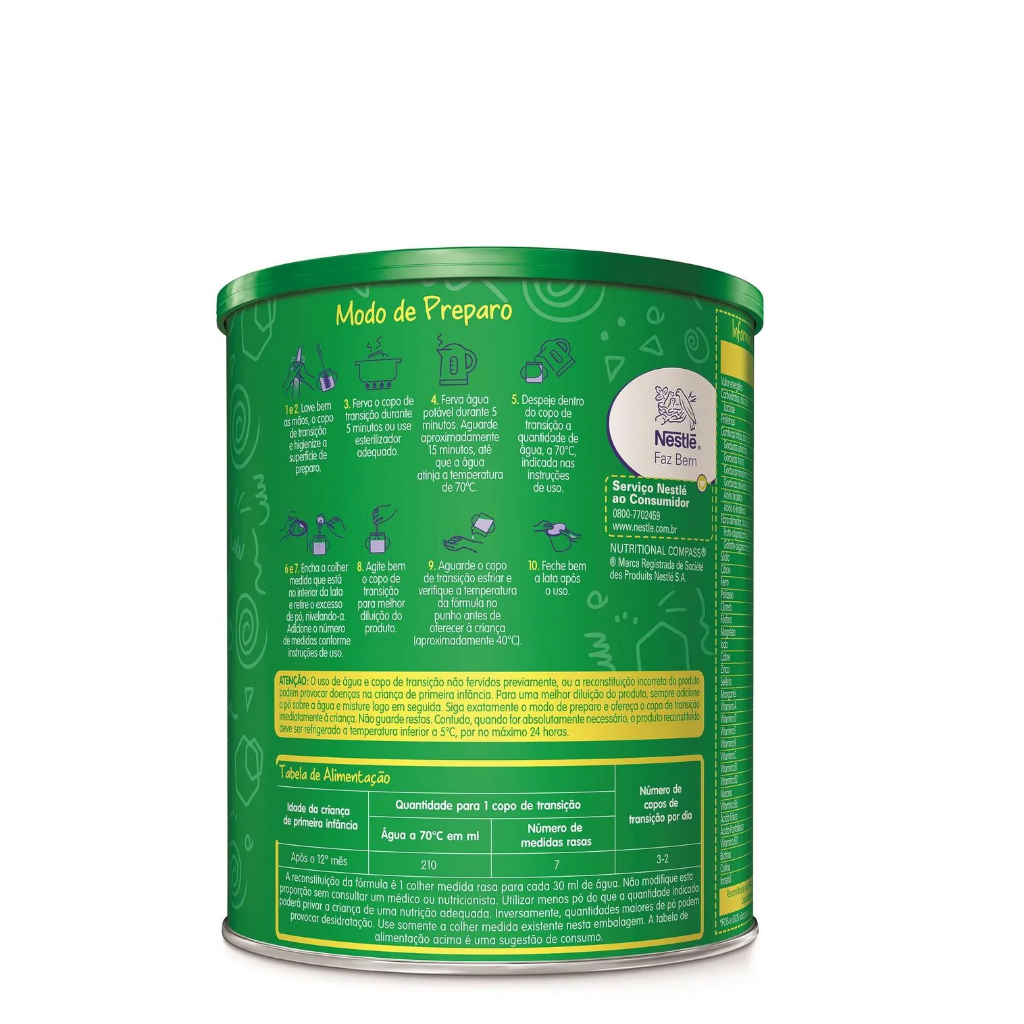 Descrição À medida que seu bebê cresce, suas necessidades também mudam. A Nestlé oferece-lhe o que há de mais completo para a sua saúde e o desenvolvimento. É a empresa de alimentos líder em nutrição, saúde e bem-estar, dedicada a gerar diferentes tipos de leite para atender às necessidades nutricionais de cada bebê. Nutrição de primeira linha Devido ao seu formato em pó, este tipo de leite irá durar mais tempo, sem a necessidade de ser refrigerado. Por sua vez, você poderá transportá-lo com muita facilidade e só precisará de um pouco de água quente para prepará-lo. Mais fácil e seguro A embalagem lata é especialmente projetada para fazer a preparação da fórmula infantil mais fácil e segura. Uma vez aberto, você pode preservá-lo, garantindo o seu sabor e a consistência. Aviso legal • Deve ser administrado sob supervisão médica. • O Ministério da Saúde informa: o aleitamento materno evita infecções e alergias e é recomendado até os 2 (dois) anos de idade ou mais.