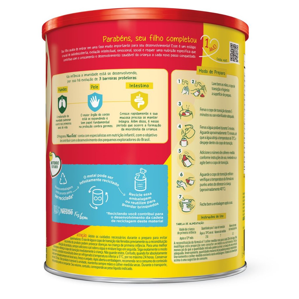Ninho Fases 1+ Fómula Infantil foi desenvolvido para atender especialmente às necessidades de crianças entre 1 a 3 anos de idade. Além da sua fórmula contar com fibras alimentares prebióticas (que auxiliam no funcionamento do intestino), também conta com um complexo de 18 vitaminas e minerais*. VITAMINAS: Rico em Vitaminas C, D, B1, Ácido Pantotênico e Biotina. Além disso, também é uma fonte de Vitamina A, E, K, B2, B6, B12 e Ácido Fólico. MINERAIS: Rico em cálcio e fonte de Ferro, Selênio, Zinco, Fósforo e Cobre. O Ministério da Saúde informa: o aleitamento materno evita infecções e alergias e é recomendado até os 2 (dois) anos de idade ou mais. O Ministério da Saúde informa: após os 6 (seis) meses de idade continue amamentando seu filho e ofereça novos alimentos.