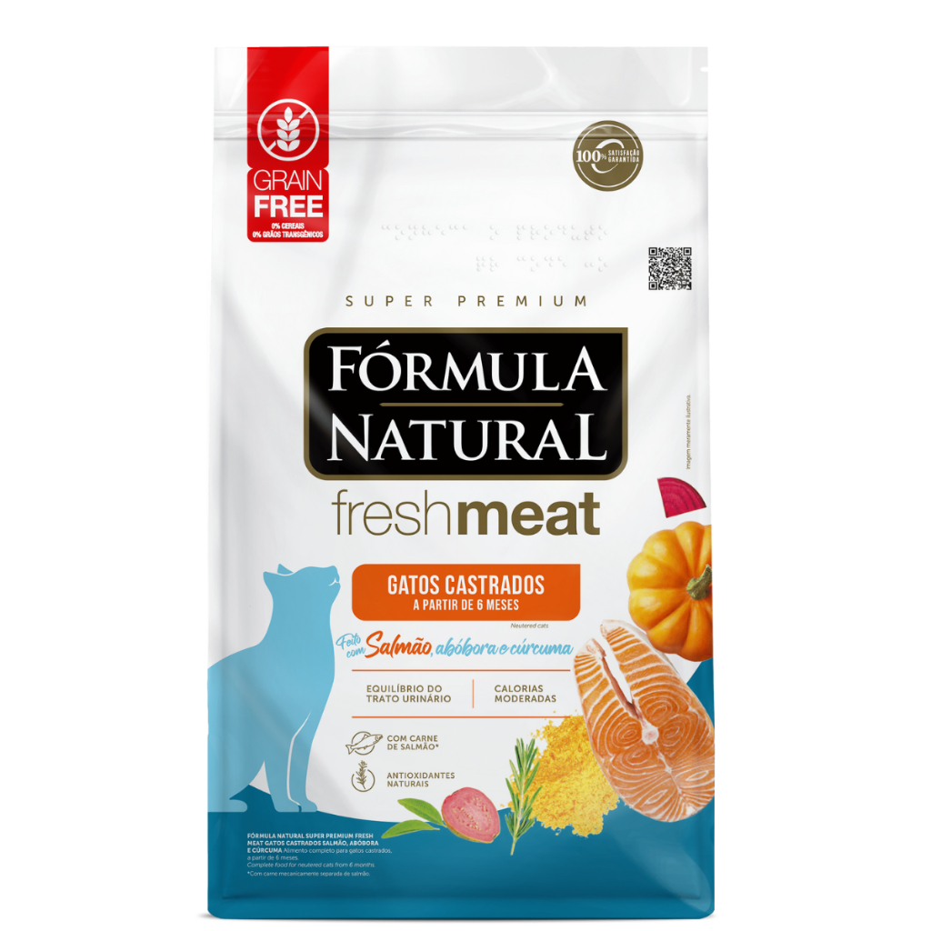 Desenvolvida por médicos veterinários, a linha Fórmula Natural Fresh Meat utiliza os conceitos mais avançados da nutrição de cães e gatos. Naturalmente saborosa e nutritiva, possui como grande diferencial a utilização de carne fresca e fontes especiais de carboidratos, fibras, vitaminas e minerais, como as frutas e vegetais. É uma linha completa que oferece versões com cuidados específicos para diferentes necessidades e estágios de vida. Fórmula Natural Fresh Meat Gatos Castrados Sabor Salmão oferece um teor menor de calorias e mais fibras para gatos adultos castrados. Equilíbrio do sistema urinário Calorias reduzidas Equilíbrio da flora intestinal Pelagem bonita e brilhante. Composição Básica: Carnes selecionadas (carne mecanicamente separada de salmão (10%), carne mecanicamente separada de frango e fígado de frango), farinha de torresmo, farinha de vísceras de aves, farinha de mandioca, fécula de mandioca, farinha de ervilha, fécula de batata, óleo de aves, óleo refinado de peixe, hidrolisado de fígado de aves e suíno, fibra de cana-de-açúcar, farelo de goiaba, frutas e vegetais desidratados (abóbora (0,5%), manga, maçã, cenoura), polpa de beterraba, farinha de linhaça, cloreto de sódio, biomassa de microalgas (Schizochytrium sp.), parede celular de levedura, inulina, frutooligossacarídeos, extrato de yucca (0,04%), vitaminas (A, D3, E, K3, B1, B2, B5, B6, B12, C, ácido fólico, niacina, biotina, cloreto de colina), minerais (sulfato de ferro, sulfato de cobre, sulfato de manganês, sulfato de zinco, iodato de cálcio, selenito de sódio, proteinato de zinco, levedura enriquecida com selênio, proteinato de manganês), cloreto de potássio, lisina, metionina, taurina, ácido propiônico, ácido fosfórico, ácido cítrico, cúrcuma (0,01%), extratos de chá verde, hortelã e alecrim, concentrado de tocoferóis (0,01%), L-carnitina. ENVIAMOS EM PACOTES ORIGINAIS DE 500G