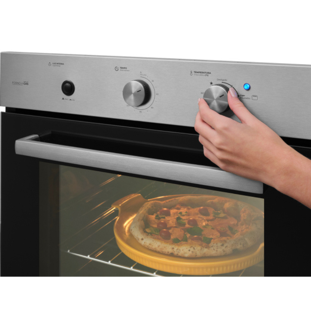 O Forno a Gás de Embutir Fischer Infinity 78 litros com Grill foi projetado para acompanhar a sua vida, transformando sua cozinha. Com um design moderno, ele harmoniza com todos os produtos da Linha Infinity e é ideal para os diversos preparos do dia a dia. Com 78 litros de capacidade o Forno a Gás de Embutir Fischer Infinity com Grill possui 3 níveis de altura que permitem a preparação de uma ampla variedade de receitas. Conta com porta de vidro duplo que retém o calor no interior do forno, economizando energia e proporcionando segurança. O ajuste de temperatura é preciso, variando de 160 a 260°C, e conta com um timer com aviso sonoro de conclusão, o que torna o preparo das receitas muito mais prático. Esse Forno a Gás de Embutir oferece diversas funções adicionais, como o grill, ideal para finalizar suas receitas, deixando-as mais crocantes e saborosas. Além disso, possui luz interna que facilita a visualização dos assados. É o forno ideal para quem busca praticidade e segurança. Conta com revestimento interno EasyClean, que não absorve gordura e facilita a limpeza, além de uma válvula corta gás que proporciona total segurança ao utilizar o produto, garantindo tranquilidade no preparo das receitas. Com uma história pautada na credibilidade e qualidade de seus produtos, a Fischer se destaca como a marca líder em fornos, projetados para acompanhar sua vida Característica do Produto :: Cor: Inox :: Revestimento interno: Tecnologia EasyClean (de fácil limpeza) :: Grill/Dourador: Sim :: Grade interna: Uma grade cromada, ajustável com 3 níveis de altura :: Lâmpada: Sim :: Bandeja coletora para resíduos: Não :: Funcionamento: Gás :: Consumo: Consumo de gás: 0,122 kg/h :: Painel: Painel em vidro temperado preto ou em aço inox escovado :: Timer: Timer com aviso sonoro de conclusão :: Temperatura: 160 a 260 °C :: Relógio: Não :: Função Turbo: Não :: Vidro da porta: Duplo :: Potência: 877,5W :: Acessórios da embalagem: Acessórios da embalagem: Manual de instruções :: Altura interna: 38,3 cm :: Largura interna: 44 cm :: Profundidade interna: 46 cm Especificações Técnicas :: Marca: Fischer :: EAN 127V - 7896513323087 :: EAN 220V - 7896513323032 Dimensões do produto: :: Dimensões internas do produto: (AxLxP): 383 x 440 x 460,5 mm :: Dimensões externas do produto: (AxLxP): 600 x 595 x 623 mm :: Dimensões externas da embalagem: (AxLxP): 548 x 670 x 677 mm :: Dimensões do nicho de instalação: (AxLxP): 590 x 560 x 575mm PESO: 26 KG GARANTIA: 12 MESES