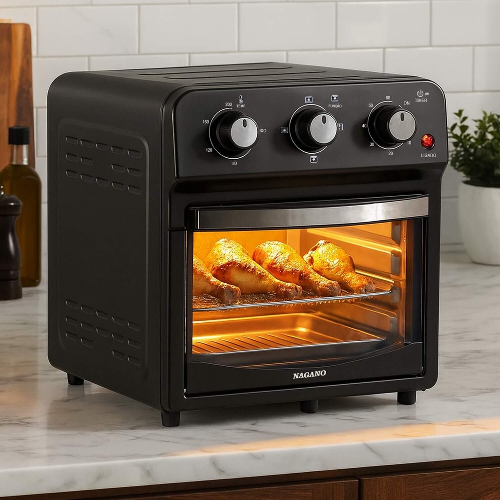 Forno Air Fryer 12L 1500W Nagano – Saúde, Sabor e Praticidade em um Só Produto! Transforme sua rotina na cozinha com o Forno e Fritadeira Air Fryer Nagano 12L, ideal para quem deseja preparar refeições deliciosas, saudáveis e rápidas! Com tecnologia de circulação de ar 360°, ele permite assar, grelhar, gratinar e até desidratar os alimentos com pouco ou nenhum óleo, mantendo a crocância e o sabor irresistível. Com potência de 1500W, você economiza tempo no preparo sem abrir mão da qualidade. Seu controle analógico intuitivo facilita o uso, tornando-o perfeito para todas as idades. Seja para um lanche rápido ou aquele almoço especial, a Air Fryer Nagano entrega desempenho, versatilidade e saúde em cada preparo! Além disso, com capacidade de 12L, é possível preparar porções maiores para toda a família — sem precisar de vários eletrodomésticos. Benefícios do Forno Air Fryer Nagano 12L Cozimento uniforme com ar quente 360° Evita queimar de um lado e deixar cru do outro. Zero ou pouquíssimo óleo no preparo Alimentação mais saudável sem abrir mão do sabor. Alta capacidade de 12L Ideal para porções grandes ou refeições completas. Desempenho potente com 1500W Cozinha mais rápido e economiza tempo. Multifuncional: assa, grelha, gratina e