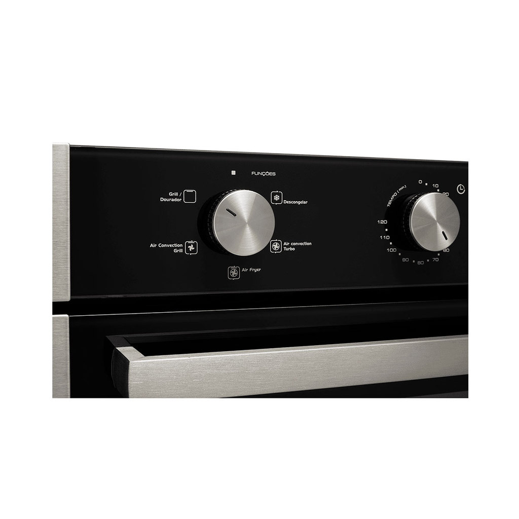 Forno Elétrico de Embutir Fischer Infinity Com Air Fryer 50L InoxO Forno Elétrico de Embutir Fischer Infinity, com capacidade de 50 litros e função Air Fryer, é ideal para cozinhas pequenas e práticas, oferecendo funções essenciais para preparar uma variedade de receitas, desde as mais suculentas até as mais delicadas. Com 50 litros de capacidade, esse forno é perfeito para você e sua família. Ele possui um timer de até 120 minutos e controle automático de temperatura, permitindo ajustes entre 50°C e 250°C. Inclui cinco funções: Descongelar, Air Convection Turbo, Air Fryer, Air Convection Grill e Dourador. O sistema de resfriamento interno ajuda a prevenir o superaquecimento no espaço de instalação, proporcionando mais segurança e evitando riscos de aquecimento excessivo no móvel. A porta com vidro duplo oferece maior segurança e eficiência energética, pois minimiza a perda de calor. O revestimento interno é EasyClean, facilitando a limpeza. Especificações Técnicas do Forno Elétrico Fischer Infinity:- Tensão: 127V, 220V (não é bivolt) - Cor: Inox - Capacidade interna do forno: 50 litros - Revestimento interno: Tecnologia EasyClean (de fácil limpeza) - Grill/Dourador: Sim - Tripla chama: Não - Botões removíveis: Sim - Grade interna do forno: 2 grades cromadas ajustáveis em até três posições - Vidro interno do forno removível: Sim - Lâmpada: Sim - Bandeja coletora para resíduos: Sim - Instalação gratuita: Não - Funcionamento: Elétrico - Consumo: 0,83 kWh - Potência das Bocas: 12W - Painel: Eletromecânico - Timer: 120 minutos - Temperatura: 50°C a 300°C - Relógio: Não - Função Turbo: Sim - Potência: 2422 W - Função Dourador: Sim - Acessórios da embalagem: 01 manual de instruções, 01 kit de fixação, 02 grades cromadas. - Altura interna: 25 cm - Largura interna: 44 cm - Profundidade interna: 44 cm Garantia pelo fabricante 01 ano.