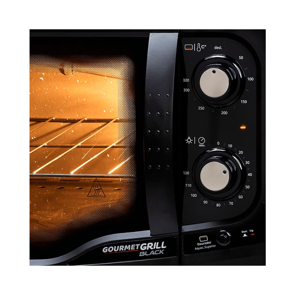 Forno Elétrico Fischer Gourmet Grill de Bancada 44L Black O novo forno elétrico de bancada Gourmet Grill, possui pés antiderrapantes que oferecem mais estabilidade e segurança no uso do produto. Além disso, o vidro duplo tem a função de manter por mais tempo o calor interno, conservando a temperatura dos assados e reduzindo o consumo de energia elétrica. Com controle de temperatura automático de 50ºC a 320ºC e timer de até 120 minutos com aviso sonoro, o novo Gourmet Grill é perfeito para a sua cozinha. Diferenciais Timer e Temperatura Com até 120 minutos, o Timer possui aviso sonoro. Suas receitas perfeitas no tempo correto! Além disso, o controle automático de temperatura de 50oC até 320oC, e potência de 1.750w Lâmpada Interna Possui lâmpada interna que facilita a visualização dos assados. Vidro Duplo A porta com vidro duplo impede a fuga de calor, economizando energia. Autolimpante O revestimento interno é Autolimpante, ou seja, a limpeza ocorre através do processo de volatilização. Detalhes e Especificações Técnicas - Timer de até 120 minutos com aviso sonoro- Dourador- Lâmpada interna com proteção- Luz piloto (indica quando o forno está ligado)- Controle independente das resistências- Controle automático de temperatura de 50ºC a 320ºC- Porta com abertura lateral- Frontal em termoplástico- Grade cromada removível (2 alturas)- Bandeja esmaltada para resíduos- Corpo interno autolimpante- Corpo externo pintado preto- Porta com vidro duplo serigrafado- Isolamento térmico - Pés antiderrapantes- Produto certificado pelo INMETRO (portaria 371) Tensão: 127V ou 220V (Não é bivolt) Potência: 1750W Consumo (Bolo inglês): 060kWh Corrente 13,8A (127V) - 7,95A (220V) Frequência: 50 - 60Hz Controle: Eletromecânico Lâmpada: 1 x 15W Capacidade: 44 litros Cor/Acabamento: Branco Dimensões internas do produto (AxLxP): 26,7 x 39,2 x 42,5 cm Dimensões externas do produto: (AxLxP): 37 x 57,5 x 52 cm Dimensões externas da embalagem (AxLxP) 38,5 x 61,6 x 54,4 cm Peso Líquido: 14,21kg Peso Bruto: 15,66kg Código EAN (127V): 7896513313460 Código EAN (220V): 7896523313477