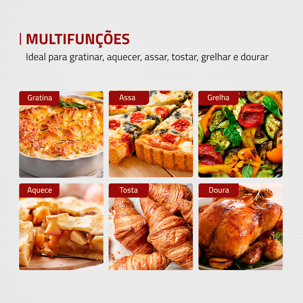 O forno elétrico Grand Family II FR-52 da Mondial tem muito espaço para você caprichar nas receitas da sua família. Com capacidade para 52 litros, ele é multifuncional: aquece, cozinha, tosta, assa, gratina e grelha os alimentos. Possui controle de temperatura, grelha com regulagem de altura, timer de 90 minutos com desligamento automático e alta potência de 1800W. Saiba mais sobre o FR-52 da Mondial: CAPACIDADE DE 52 LITROS: Alto desempenho e ótimo espaço! Ideal para o preparo de receitas para toda a família. MULTIFUNÇÕES: Ideal para aquecer, cozinhar, tostar, assar, gratinar e grelhar de maneira rápida e eficiente. POTÊNCIA DE 1800W: Alta potência que assegura mais agilidade e eficiência no preparo de receitas variadas. SELETOR DE RESISTÊNCIA: São 3 opções de aquecimento interno para distribuir melhor o calor. TIMER DE 90 MINUTOS: Mais liberdade e segurança para você fazer outras tarefas enquanto o forno trabalha. Com aviso sonoro, o aparelho desliga automaticamente ao término do preparo. MAIS PRATICIDADE: A regulagem de altura da grelha oferece versatilidade para um cozimento ideal. CONTROLE DE TEMPERATURA: De 100°C até 250°C: Ajuste a intensidade da temperatura de acordo com a receita que vai preparar. PUXADOR E BOTÕES EM AÇO INOX: Design moderno, com mais durabilidade e resistência. UM ANO DE GARANTIA MONDIAL: A Mondial é a escolha de milhões de consumidores. Mondial, a escolha inteligente!