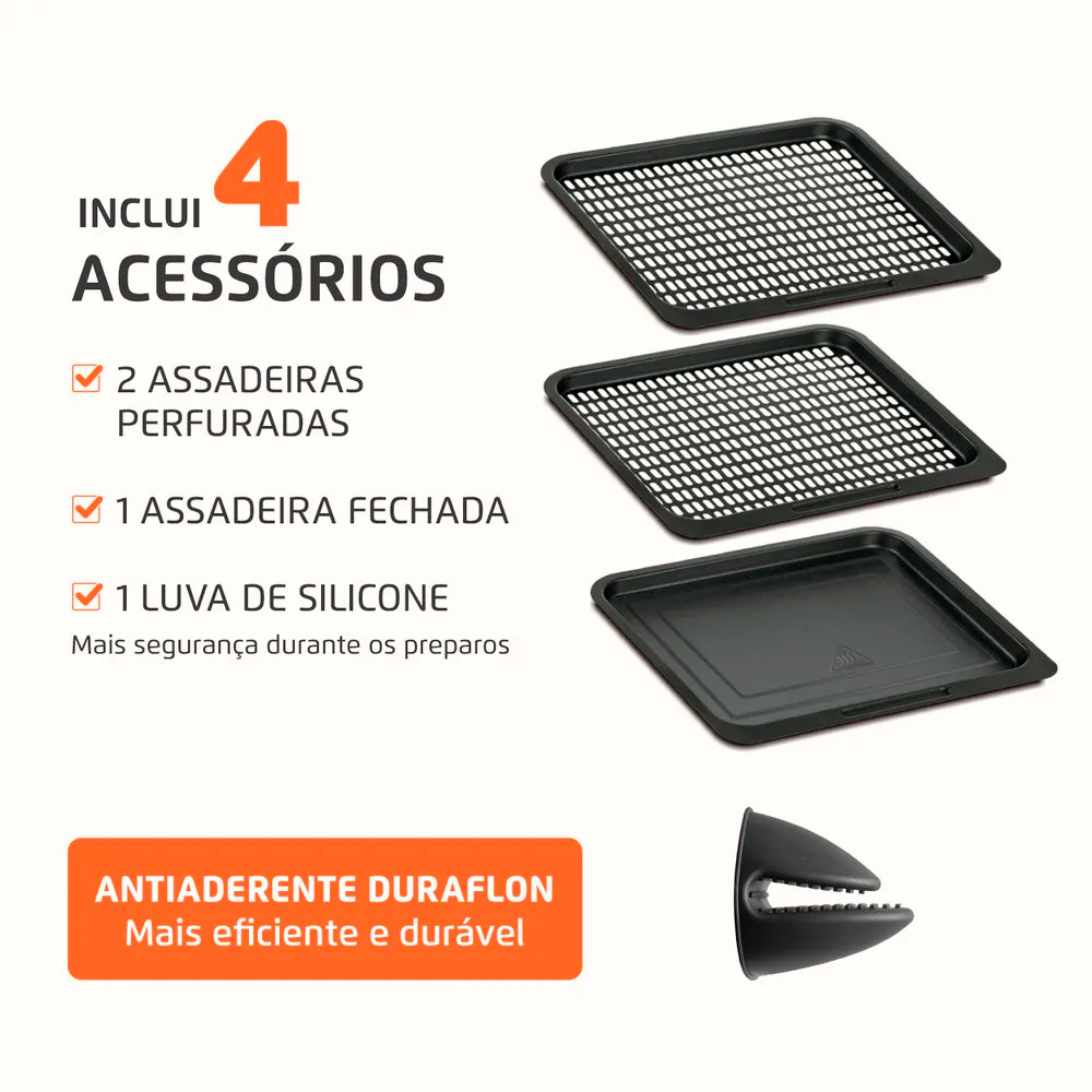Fritadeira Air Fryer Forno Oven 12L Mondial - Cozinha com Saúde e Praticidade A Fritadeira Air Fryer Forno Oven 12L Mondial é uma solução 2 em 1 para sua cozinha, combinando a tecnologia de fritura a ar com o espaço e versatilidade de um forno. Com capacidade para 12 litros, é ideal para preparar grandes porções e receitas variadas para até 6 pessoas. CARACTERÍSTICAS PRINCIPAIS Painel digital com 10 funções pré-programadas: batata, frango, carne, peixe, camarão, pão de queijo, pizza, bolo, legumes e reaquecer Tecnologia de circulação de ar quente para cozimento uniforme e saudável Cesto e assadeiras com antiaderente Duraflon exclusivo da Mondial Porta com visor amplo e iluminação interna para acompanhar o preparo Timer de até 90 minutos e desligamento automático BENEFÍCIOS Cozinha com menos óleo e mais saúde Praticidade e rapidez no preparo de receitas Versatilidade para preparar diversos pratos, desde batata frita até bolos e pizzas Fácil de limpar e manter QUEM DEVERIA COMPRAR ESSE PRODUTO Este produto é ideal para: - Famílias que buscam uma opção saudável e prática para cozinhar - Pessoas que gostam de cozinhar e experimentar novas receitas - Quem quer reduzir o consumo de óleo e gordura na cozinha - Profissionais da culinária que precisam de um equipamento versátil e eficiente ESPECIFICAÇÕES TÉCNICAS Potência: 2000W (127V) Capacidade: 12 litros Tipo de tomada (amperes): 20A Segurança: Aviso sonoro e desligamento automático Dimensões (AxLxP): 39 cm x 32 cm x 36,1 cm Peso: 7,6 kg DIMENSÕES E PESO DO PRODUTO SEM EMBALAGEM: 39 cm x 32 cm x 36,1 cm, 7,6 kg COM EMBALAGEM: 41 cm x 35 cm x 40 cm, 8,5 kg (aproximadamente) A Fritadeira Air Fryer Forno Oven 12L Mondial é uma escolha inteligente para quem busca praticidade, saúde e versatilidade na cozinha.