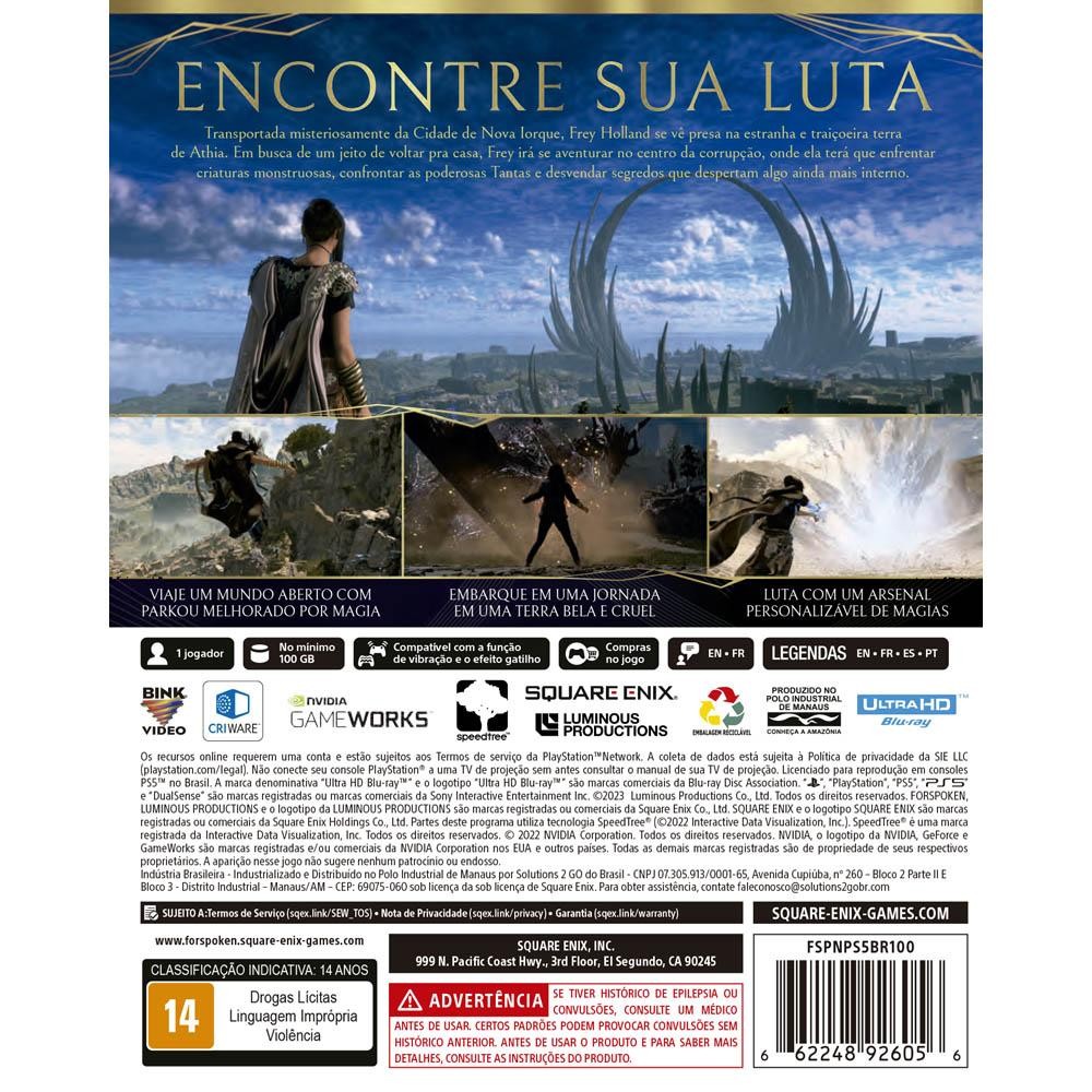 Forspoken - Playstation 5 Forspoken conta a jornada de Frey, uma jovem nova-iorquina levada à bela e cruel Athia. Frey precisa usar suas habilidades mágicas recém-descobertas para explorar e enfrentar criaturas monstruosas em busca de um caminho de volta para casa. Características: Funcionalidades do Jogo: A odisseia de uma heroína relutante: Leve Frey em uma aventura inesquecível à procura de um caminho de volta para casa após ser misteriosamente transportada para uma terra extraordinária. Desvende os mistérios de Athia durante as viagens de Frey pela nefasta Ruptura e descubra como manipular um poder extraordinário. Um mundo aberto belo e cruel: Explore os vastos reinos de Athia, uma terra peculiar repleta de paisagens formidáveis e criaturas mágicas trazidas à vida pelos gráficos incríveis e pela alta tecnologia. Aventure-se nas entranhas dos territórios corrompidos onde uma escuridão misteriosa perverte tudo o que toca. Parkour intuitivo proporcionado por magia: Suba muros, salte sobre cânions, pule de alturas vertiginosas e corra por vastos cenários. As habilidades únicas de Frey permitem que ela percorra o mundo aberto com facilidade e fluidez. Arsenal de feitiços personalizável: Enfrente monstros corrompidos em combate mágico com uma gama de habilidades poderosas que cobrem uma variedade de estilos de jogo, desde adrenalina pura a estratégia. Plataforma: Playstation 5 Publisher: Square Enix Espaço em Disco: Min 100GB Gênero: Ação / Aventura / RPG Quantidade de Jogadores: 1 jogador offline Idioma: Áudio: Inglês, Japonês / Legendas: Inglês, Japonês, Português Classificação Indicativa: 14 Anos - Drogas Lícitas, Violência Ano de Lançamento: 2023 Conteúdo da Embalagem: 1 - Forspoken - Playstation 5 Garantia: 12 meses contra defeito de Fabricação. Imagens meramente ilustrativas.