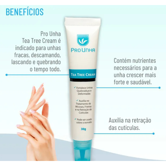 Apresentando o Tea Tree Cream 30g Pro Unha, o segredo para unhas saudáveis e radiantes! Este creme exclusivo foi desenvolvido para quem sofre com unhas fracas, descamando ou que lascam com frequência, proporcionando uma hidratação perceptível desde a primeira aplicação. Sua fórmula única, enriquecida com Óleo de Melaleuca, Óleo de Copaíba e Óleo de Castanha do Pará, oferece uma série de benefícios: - Fortalecimento e embelezamento: Nutre e hidrata tanto as unhas quanto as cutículas, melhorando sua aparência e saúde geral. - Auxílio no crescimento: Estimula o crescimento saudável das unhas, fornecendo os nutrientes essenciais para uma aparência mais forte e bonita. - Ação antimicótica: Protege contra infecções fúngicas, mantendo as unhas livres de fungos. - Clareamento de unhas amareladas: Ajuda a restaurar a cor natural das unhas, deixando-as mais brilhantes e bonitas. - Suavização de unhas ásperas e estriadas: Deixa as unhas mais lisas e uniformes, melhorando sua textura e aparência.Informações Técnicas: Composição: Aminometilpropanol, Digluconato de Clorexidina, Etanol, Glicerina, Metilcloroisotiazolinona, Metilisotiazolinona, Propileno Glicol, Óleo Essencial de Melaleuca Altenifolia, Acetato de Tocoferol, Ciclopentasiloxane, Polissorbato 20, BHT, Óleo de Copaiba, Oleato de Sorbitano, Álcool Cetearilico, Óleo de Castanha da Amazônia, Alantoina, Lanolina, Ácido Salicílico, Manteiga de Cupuaçu, Polissorbato 60, Copolímero de Dimeticona/vinil Dimeticona, Triclosan, Ácido Esteárico, PPG-5-CETETH-20, Hidroximetilcelulose, Ácido Undecilenico, Estearato de Polietilenoglicol, Queratina Hidrolisada, Água. Conteúdo: 30g Marca: Pro Unha Precauções: - Conservar em local seco e fresco. - Não ingerir. Mantenha fora do alcance das crianças. - Não utilize em crianças com menos de 3 anos. - Em caso de contato com os olhos, lave com abundância e procure auxílio médico. - Não utilize se a embalagem estiver violada. Transforme suas unhas com o Tea Tree Cream 30g Pro Unha - o cuidado completo que elas merecem, ao alcance das suas mãos! NOVA EMBALAGEM