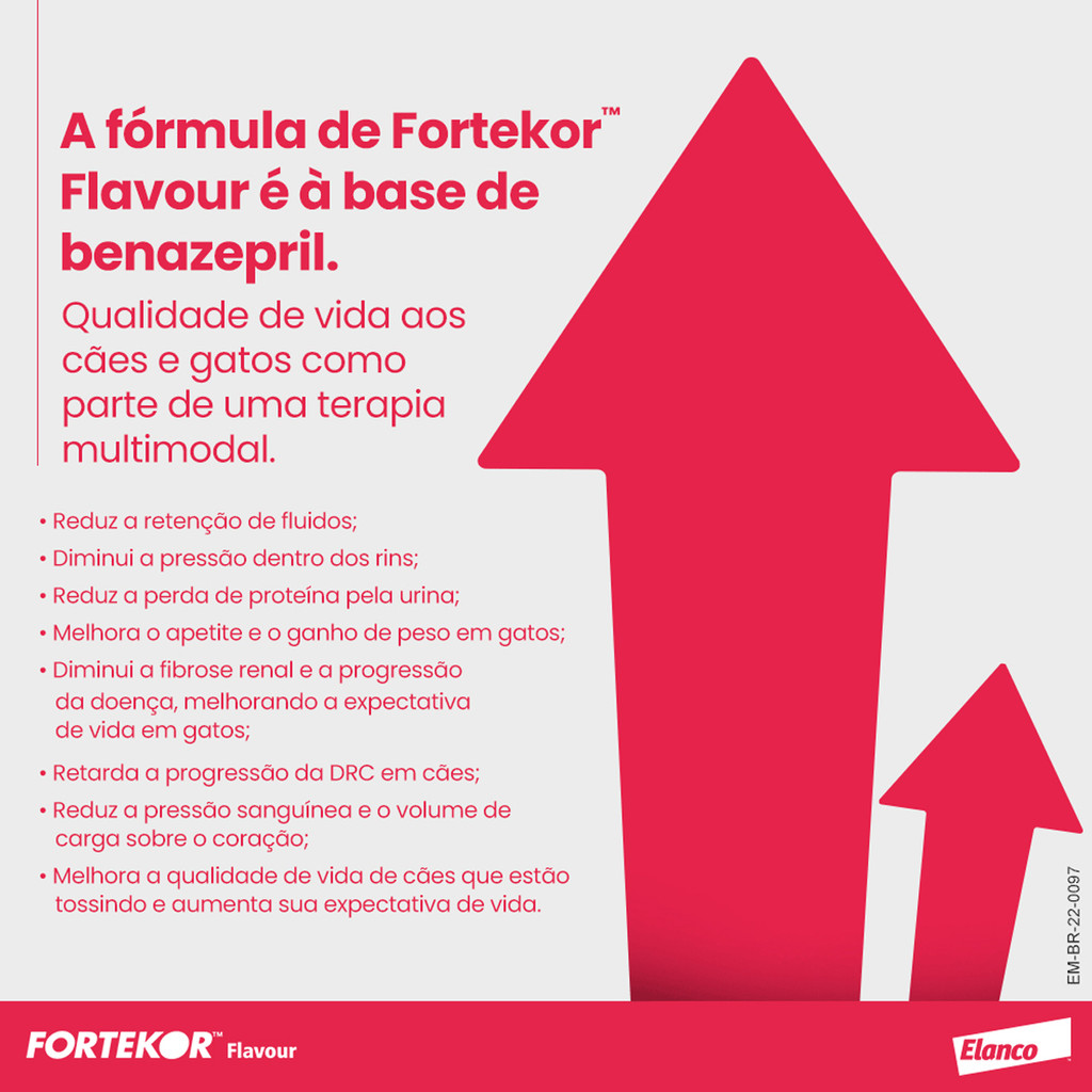 FORTEKOR 5 MG Fortekor Flavour é indicado para tratamento da Insuficiência Cardíaca Congestiva em cães e Doença Renal Crônica em gatos. Modo de usar Insuficiência Cardíaca Congestiva em cães A dose recomendada é de 0,25 mg a 0,50 mg de cloridrato de benazepril para cada quilo de peso corporal, por via oral, uma vez ao dia. Pode ser administrado com ou sem alimento. A dose pode ser dobrada a critério do médico veterinário, mantendo a frequência uma vez ao dia. Doença Renal Crônica em gatos A dose recomendada é de 0,5 mg de cloridrato de benazepril, para cada quilo de peso corporal, por via oral, uma vez ao dia. Pode ser administrado com ou sem alimento. Princípio ativo Cloridrato de benazepril. Administração Via oral. Cães – dose de 0,25 a 0,5 mg/kg – administrado uma vez ao dia. Pode ser dobrada a critério do médico veterinário, mantendo a frequência uma vez ao dia, Gatos – dose de 0,5 mg/kg – administrado uma vez ao dia. As metades remanescentes devem ser colocadas no blister aberto e guardadas (durante 1 dia no máximo) na caixa original do produto. Apresentações Cartucho contendo 2 blisters de alumínio com 14 (quatorze) comprimidos cada, totalizando 28 comprimidos. Contra-indicações vide bula antes da administração. *Consulte um veterinário, ou o Técnico Elanco da sua região para maiores informações sobre o uso desse produto.