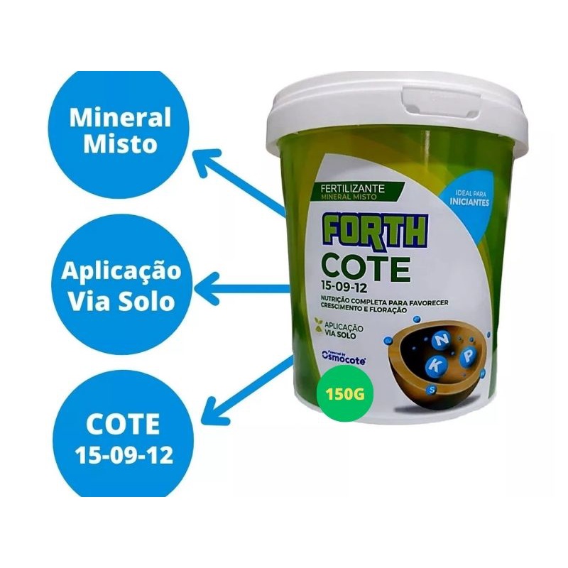 Você está começando a cuidar de plantas e não sabe qual adubo utilizar? Osmocote é perfeito pra você, use nas mudinhas, nas flores, nos frutos, na real pode usar em tudo sem medo. É completo nutricionalmente, encapsulado e tem duração de 5 meses no solo. Marca líder no mundo, Osmocote é o produto mais testado e usado em nutrição de viveiros desde 1964, e agora reembalado no Brasil com a marca FORTH COTE. Fertilizantes NPK ou NPK+Mg+ME de liberação controlada, recobertos com uma resina orgânica biodegradável, para uso em viveiros, estufas, transplantes de mudas, entre outros cultivos. Esse conjunto de cápsulas formam grãos uniformes, que facilitam o manuseio e aplicação, garantindo melhor distribuição dos elementos contidos no produto. Projetado para nutrir a cultura durante todo o seu ciclo de crescimento, libera nutrientes vitais de forma controlada em termos de dosagem e no momento exato de sua absorção. Reduz drasticamente o uso de mão de obra, elimina o risco de salinização, e proporciona uma qualidade superior às plantas. Recomendações de uso: No plantio: Misturar ao substrato/terra que será utilizado no plantio. Após plantio: Espalhar na supefície ou misturar ao substrato/terra Plantas em geral em vasos ou jardineiras: Dosagem: 4 gramas (colher de café) 1 a 2 colheres por litro de substrato/terra Frequência: A cada 5 meses Aplicação no solo: Dosagem: 40 a 100 gramas por metro quadrado Frequência: A cada 5 meses Você está adquirindo: 01 Adubo Fertilizante FORTH COTE 15-09-12 + Micronutrientes 150g