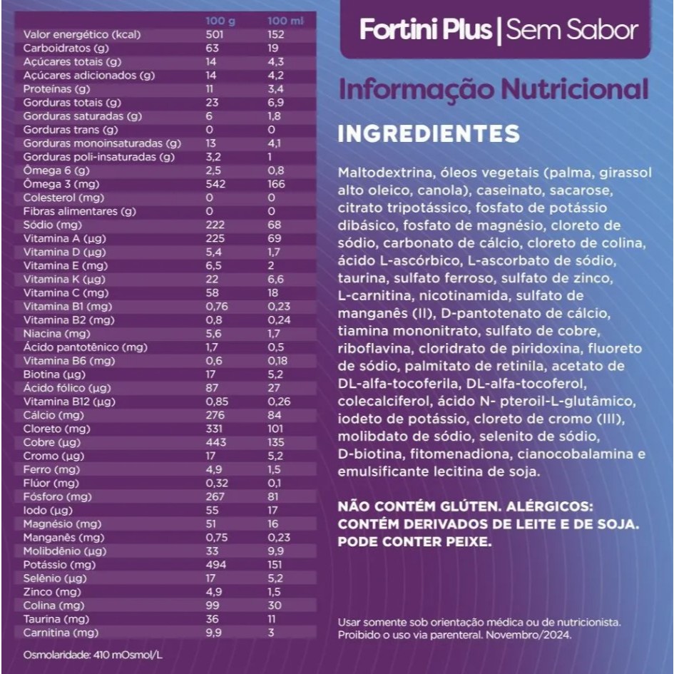 Fortini Plus é um suplemento infantil hipercalórico, com 1,5kcal/ml, com nutrientes que contribuem para recuperar a nutrição de crianças de 3 a 10 anos de idade, que estão com dificuldade de manter ou ganhar peso e/ou crescer adequadamente. Contém 29 vitaminas e minerais, oferece mais energia em menor volume para rápida recuperação nutricional e é isento de lactose. Fortini Plus: Mais energia e nutrientes para rápida recuperação nutricional Durante a infância, uma série de motivos podem levar a um estado de risco nutricional. Problemas como má alimentação, falta de apetite e até infecções recorrentes podem resultar em carência de nutrientes essenciais para o crescimento e desenvolvimento da criança. Nesses casos, é essencial o acompanhamento de um médico ou nutricionista e, se necessário, utilizar um suplemento infantil capaz de contribuir para uma dieta nutricionalmente balanceada e completa. O que é e para que serve Fortini Plus: Fortini Plus é um suplemento de nutrição oral e enteral infantil hipercalórico, com 1,5Kcal/mL, para crianças que precisam de um aporte energético maior, por terem dificuldade de manter ou ganhar peso, e precisam recuperar a nutrição. Contém 29 vitaminas e minerais, oferece mais energia em menor volume para rápida recuperação nutricional e é isento de lactose. Disponível nas versões sabor baunilha e sem sabor, Fortini Plus vai bem com tudo! Alimentos doces ou salgados de acordo com a preferência da criança, como: molhos, purês, iogurtes, sucos, etc. Fortini Plus foi desenvolvido para crianças com necessidades especificas e deve ser consumido conforme recomendação do profissional de saúde. NÃO CONTÉM GLÚTEN. ALÉRGICOS: CONTÉM DERIVADOS DE LEITE E DE SOJA. PODE CONTER PEIXE.