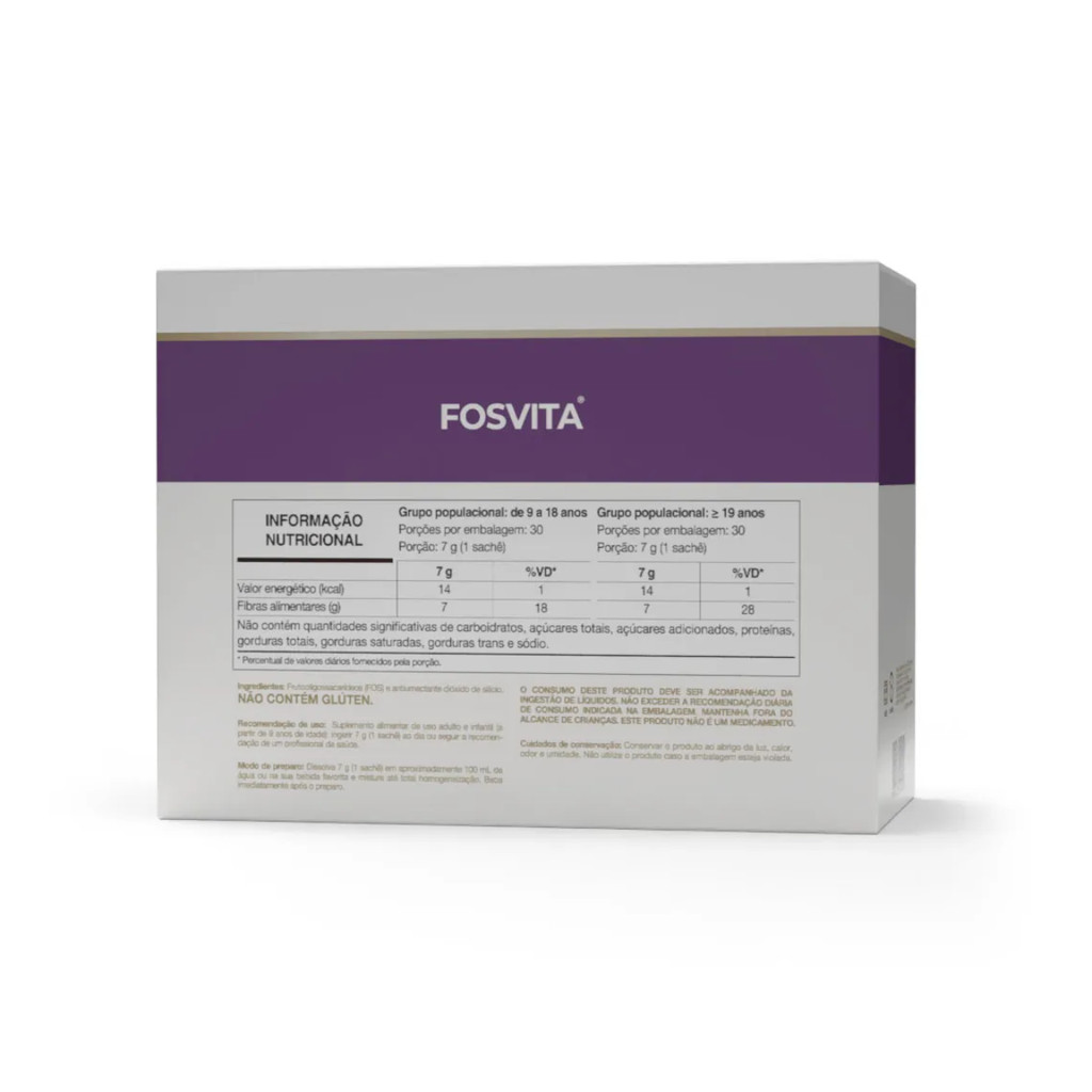 O Fosvita da Vitafor é um suplemento alimentar à base de Frutooligossacarídeos (FOS), fibra solúvel que pode ser adicionado a qualquer tipo de alimento ou bebida, não alterando sua textura, cor ou sabor. As fibras alimentares auxiliam no funcionamento do intestino. INFORMAÇÕES DE DESTAQUE - Suplemento alimentar a base de Fibras; - Fibras Solúveis; - 7g de fibra alimentar por porção; - Sem sabor; - Não contém glúten. COMPOSIÇÃO Futooligossacarídeos (FOS) e antiumectante dióxido de silício. Não contém glúten. MODO DE USO Consumir 1 porção (7g) ao dia ou seguir as recomendações de um profissional de saúde.