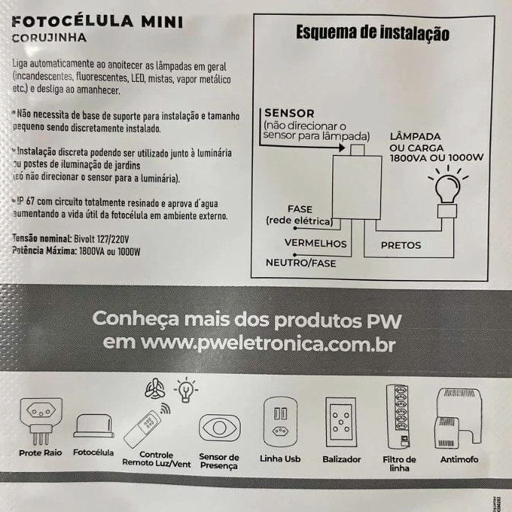 Fotocélula Mini Corujinha Bivolt PW 313 – Sensor Automático de Iluminação para Lâmpadas e Iluminação Externa Sensor Fotocélula Automático Mini Corujinha 220V/127V PW 313 – Acende e Apaga Luzes Sozinho Interruptor Fotocélula Bivolt PW 313 Corujinha – Sensor de Luminosidade para Luminárias, Fachadas e Jardins A Fotocélula Mini Corujinha Bivolt PW 313 é um dispositivo eletrônico desenvolvido para automatizar o acionamento de sistemas de iluminação, garantindo maior economia de energia, praticidade e segurança. Com design compacto e eficiente, o modelo “Mini Corujinha” é ideal para instalação em ambientes externos como fachadas, jardins, estacionamentos, varandas, corredores e portões de acesso. Este sensor fotocélula é capaz de ligar automaticamente as lâmpadas ao anoitecer e desligá-las ao amanhecer, dispensando qualquer intervenção manual. Seu funcionamento é baseado na detecção da intensidade luminosa do ambiente, ajustando o acendimento de acordo com as condições naturais de luz. Fabricada pela PW (Power Line), a Fotocélula Mini Corujinha se destaca pela alta durabilidade, baixo consumo elétrico, e compatibilidade com diversos tipos de lâmpadas – incandescentes, fluorescentes, halógenas e LED. O modelo é bivolt automático (127V/220V), facilitando a instalação sem necessidade de ajustes de tensão. Construída em material termoplástico de alta resistência, a carcaça protege o circuito interno contra intempéries e raios solares diretos, garantindo desempenho estável e vida útil prolongada. Além disso, o produto é compacto, discreto e de fácil instalação, bastando conectar os fios de alimentação e carga conforme o esquema elétrico indicado na embalagem. Principais características técnicas Modelo: PW 313 (Mini Corujinha) Tensão: Bivolt automático (127V / 220V) Potência máxima suportada: até 1000W (em 127V) / 2000W (em 220V) Corrente máxima: 10A Tipo: Sensor fotocélula de luminosidade Aplicação: Ambientes internos e externos Instalação: Em poste, parede ou luminária Função: Liga ao escurecer e desliga ao amanhecer automaticamente Cor: Cinza claro / Branco Material: Termoplástico de engenharia de alta resistência Grau de proteção: IP44 (resistente à chuva leve e poeira) Fabricante: PW Dimensões e peso aproximados Altura: 7 cm Largura: 4,5 cm Profundidade: 4,5 cm Peso: 70 g (aproximadamente) Vantagens e benefícios Economia de energia ao desligar luzes automaticamente durante o dia. Maior segurança: mantém ambientes externos iluminados durante a noite. Instalação simples e rápida. Bivolt automático, sem necessidade de seleção manual de tensão. Compatível com todos os tipos de lâmpadas. Produto compacto, leve e durável. Ideal para fachadas residenciais, comércios, condomínios, jardins e portões. fotocélula bivolt, sensor de luz automático, fotocélula mini corujinha PW313, sensor dia e noite, interruptor fotocélula, acendimento automático de luz, controle de iluminação externa, sensor luminosidade, economia de energia, iluminação residencial e comercial.