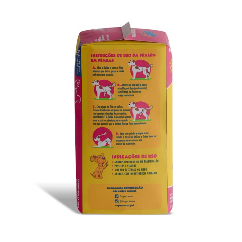 🐾 Fralda Descartável para Cães – Super Secão As fraldas descartáveis Super Secão são ideais para manter seu pet sempre sequinho, limpo e confortável! Perfeitas para cães com incontinência, no pós-operatório, no cio ou durante viagens. 💧 Alta absorção com gel super absorvente 🛡️ Barreira antivazamento 🧷 Fecho reposicionável e ajuste anatômico 🌬️ Com cobertura respirável 🧼 Ajuda a manter a higiene do ambiente 📏 TABELA DE TAMANHOS Fêmeas (rosa): • PP: 20–28 cm | 1 a 3 kg • P: 28–40 cm | 3 a 6 kg • M: 32–48 cm | 6 a 13 kg • G: 38–56 cm | 13 a 20 kg Machos (azul): • P: 30–46 cm • M: 46–60 cm • G: 60–80 cm 📦 Contém 12 unidades por embalagem ✅ Produto de uso veterinário 🏷️ Marca: Petix – Super Secão 🐶 Escolha o modelo machos ou fêmeas conforme seu pet Delicatopet – carinho, conforto e cuidado para seu pet. 🧡 Enviamos com todo cuidado de Jaraguá do Sul - SC.