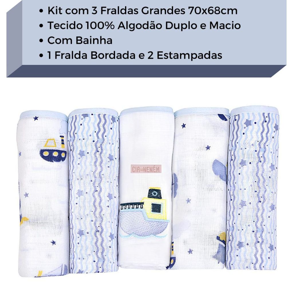 Fralda Bordada Bebê de Ombro 70x68cm Kit 5 Un. Com Bainha Cia do Neném - Minasrey