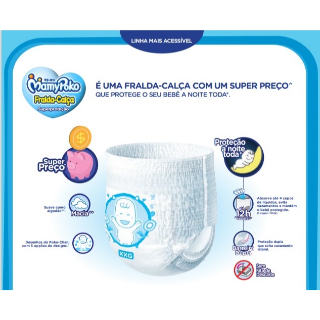 DESCRIÇÃO: Fralda-Calça pants descartável infantil marca Mamypoko Super Proteção com até 12h de Absorção. A única fralda com furinhos arejados que liberam a umidade em toda a cintura. Além de absorver até 4 copos de líquido, tem caminhos de ar que fazem o ar circular melhor dentro da fralda, e microporos que liberam a umidade de dentro para fora mantendo o bebê sempre sequinho e confortável. CARACTERÍSTICAS: - Bebê protegido a noite toda - Suave como algodão - Absorve até 4 copos de líquidos, evita vazamentos e mantém o bebê protegido - Proteção dupla que evita vazamento lateral TAMANHO: XXG - 22 Unidades - (15-26 kg) INSTRUÇÕES DE USO: - Passo 1: Vista a Fralda-Calça como uma roupinha, puxe a fralda até a altura do umbigo do seu bebê. - Passo 2: Para evitar vazamento, os elásticos das pernas e cintura devem estar encaixados e não podem ser dobrados para dentro. Como tirar: Para retirar a fralda, rasgue nas laterais. Enrole a fralda e prenda com o adesivo localizado na parte de trás da fralda.
