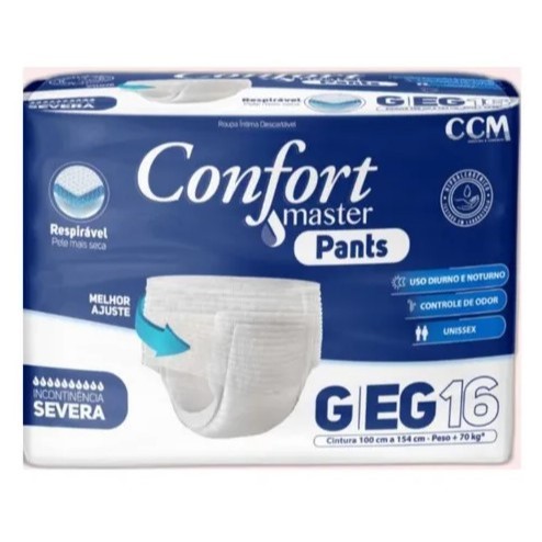 A Fralda Descartável Geriátrica Adulto Confort Master Pants é uma solução eficaz e confortável para quem precisa de cuidados diários, oferecendo proteção contra incontinência, pós-parto ou pós-operatório. Com um design discreto e materiais de alta qualidade, proporciona conforto, segurança e bem-estar durante o uso diurno e noturno. Uso diurno e noturno para maior flexibilidade Controle de odor, mantendo uma sensação de frescor prolongada Indicado para incontinência, pós-parto e pós-operatório Produto unissex, adaptável para diferentes necessidades Hipoalergênico, ideal para peles sensíveis Material respirável, ajudando a manter a pele seca e saudável Faixa de cintura: P/M 80cm a 127cm - G/EG 100 a 154 cm Peso recomendado: P/M 30kg a 70kg - G/EG acima de 70kg (aproximadamente até 90kg. Varia conforme o corpo e circunferência da cintura. Composição: Celulose, poliacrilato de sódio, polipropileno, polietileno, adesivos, elásticos, fragrância e aloe vera