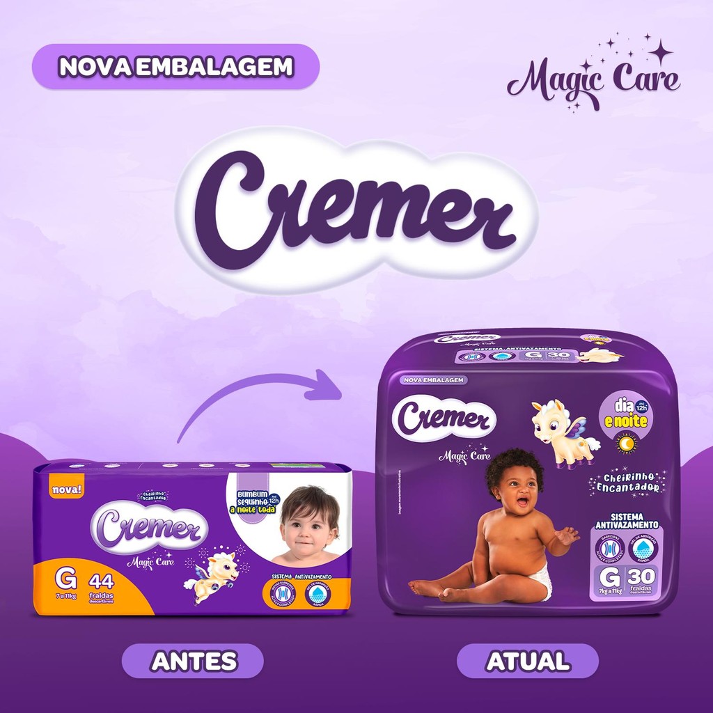 A nova fralda Cremer agora está mais fina e mais confortável, com proteção até 12h contra vazamentos! Além disso a fralda conta com um novo sistema antivazamento, composto por uma nova fita abre e fecha mais flexível e orelhas maiores que se ajustam ao corpinho do bebê, e uma camada super absorvente que distribui rápido o xixi pela fralda e evitando o retorno do líquido e garantindo que a pele do bebê fique bem sequinha. A nova Cremer traz proteção para noites tranquilas e dias mágicos, ainda mais confortáveis.