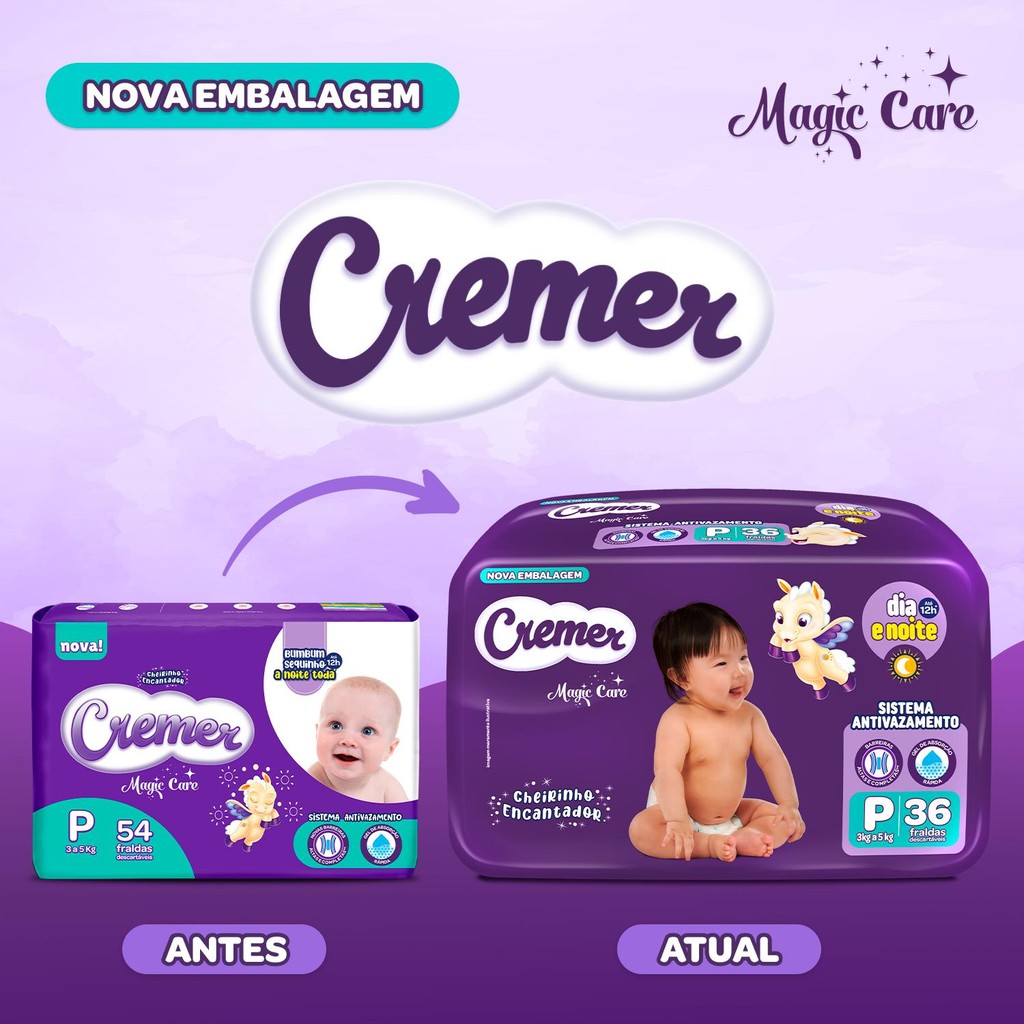 A nova fralda Cremer agora está mais fina e mais confortável, com proteção até 12h contra vazamentos! Além disso a fralda conta com um novo sistema antivazamento, composto por uma nova fita abre e fecha mais flexível e orelhas maiores que se ajustam ao corpinho do bebê, e uma camada super absorvente que distribui rápido o xixi pela fralda e evitando o retorno do líquido e garantindo que a pele do bebê fique bem sequinha. A nova Cremer traz proteção para noites tranquilas e dias mágicos, ainda mais confortáveis.