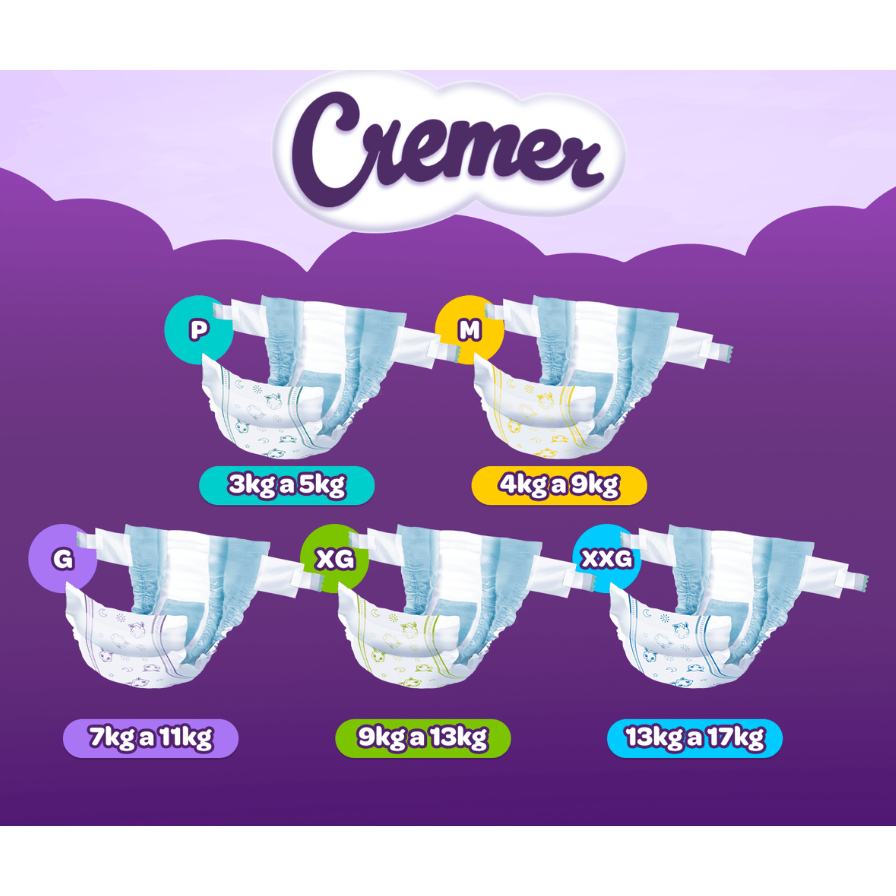 A Fralda Cremer Magic Care agora está mais fina e confortável, oferecendo proteção com um novo sistema antivazamento. Possui uma fita abre e fecha mais flexível e orelhas maiores que se ajustam ao corpo do bebê, com uma camada super absorvente que distribui rapidamente o xixi pela fralda, evitando o retorno do líquido e mantendo a pele do bebê seca. A nova Cremer Magic Care garante proteção para noites tranquilas e dias mágicos. Benefícios: - Proteção contra vazamentos e pele seca por até 12 horas, dia e noite. - Permite abrir e fechar quantas vezes for necessário sem danificar a fralda. - Novas barreiras coloridas, altas e seguras contra vazamentos, que se estendem por toda a lateral da fralda. - Distribui rapidamente o xixi pela fralda e evita o retorno do líquido, garantindo que a pele do bebê fique bem sequinha. Modo de usar: Abra e estenda a fralda com os fechos reposicionáveis para cima. Coloque o bebê no centro da fralda e passe a parte inferior da fralda entre as pernas. Fixe os fechos reposicionáveis na faixa frontal, ajustando ao corpo do bebê. Sobre a marca: Cremer é dedicada a oferecer fraldas de alta qualidade para o cuidado dos bebês. As fraldas da Cremer são projetadas para proporcionar noites tranquilas e dias confortáveis para os pequenos, garantindo a tranquilidade dos pais.