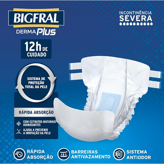 Características do Produto: Marca: Bigfral Modelo: Derma Plus Especificações do Produto: Uso adulto, unissex. Formato anatômico para conforto. Com Aloe Vera e loção hidratante para cuidado da pele. Indicador de umidade/troca para conveniência. Barreiras antivazamento para proteção extra. Sistema de inibição de odor para frescor prolongado. Benefícios: Proteção total da pele com extratos naturais hidratantes, prevenindo irritações. Oferece 12 horas de cuidado para noites tranquilas. Sistema antiodor neutraliza odores, proporcionando sensação de frescor. Indicação de Uso: Desenvolvida para adultos com incontinência urinária severa. Armazenamento: Armazenar em local fresco, seco e ao abrigo da luz solar direta. Manter afastado de fontes de calor e umidade. Evitar armazenamento próximo a produtos químicos ou perfumados. Não reutilizar a embalagem após aberta. Descartar corretamente após o uso, seguindo as recomendações de descarte de produtos descartáveis. Fornecedor: Falcon Dist.Arm.Transp.S/A-Fraldas