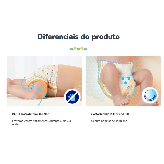 Características Adicionais: Absorve e ajuda a manter o bebê sequinho Proporciona conforto para recém-nascidos Camada super absorvente para maior segurança Fechos macios que oferecem conforto e maciez Barreiras antivazamento para proteção dia e noite Corte umbilical para melhor ajuste no corpinho do bebê