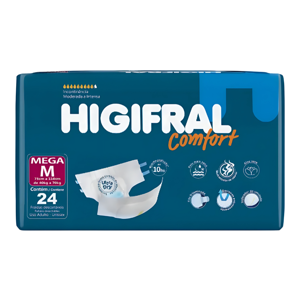 Fralda Geriátrica Adulto Higifral Confort Mega Conforto e Proteção 1 Pacote Escolha o Tamanho P-M-G-XG Fralda Geriátrica Adulto Higifral Confort Mega Descartável Unissex – Alta Absorção e Conforto A Fralda Geriátrica Higifral Confort Mega é indicada para adultos, idosos e pacientes acamados, oferecendo proteção, conforto e segurança em casos de incontinência urinária, uso geriátrico ou pós-operatório. Fabricada pela Eurofral, essa fralda descartável unissex proporciona máxima absorção, ajuste anatômico e toque suave com Aloe Vera, garantindo bem-estar e praticidade no dia a dia. Fralda Geriátrica Adulto Higifral Confort Mega Descartável Unissex – Alta Absorção e Conforto A Fralda Geriátrica Higifral Confort Mega é indicada para adultos, idosos e pacientes acamados, oferecendo proteção, conforto e segurança em casos de incontinência urinária, uso geriátrico ou pós-operatório. Fabricada pela Eurofral, essa fralda descartável unissex proporciona máxima absorção, ajuste anatômico e toque suave com Aloe Vera, garantindo bem-estar e praticidade no dia a dia. Principais Benefícios: -Dupla camada absorvente com gel superabsorvente que mantém a pele seca por mais tempo -Aloé Vera que ajuda a proteger e hidratar a pele sensível -Barreiras antivazamento que evitam escapes laterais -Quatro fitas adesivas reposicionáveis para melhor fixação e conforto -Elásticos autoajustáveis nas pernas e formato anatômico para um encaixe perfeito -Ideal para uso diário, hospitalar ou domiciliar Tamanhos disponíveis: P (Pequeno): 30 unidades – 20kg a 40kg (cintura 50cm a 70cm) M (Médio): 24 unidades – 40kg a 70kg (cintura 70cm a 90cm) G (Grande): 20 unidades – 70kg a 85kg (cintura 90cm a 110cm) XG (Extra Grande): 18 unidades – acima de 85kg (cintura até 130cm) Fralda Adulto Descartável Higifral Confort Mega – Nuni Baby A escolha certa para quem busca conforto, proteção e confiança todos os dias!