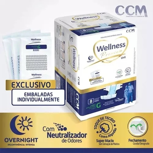 Fraldas NOTURNA Geriátricas Envio imediato Tamanho e cintura: P com 10 fraldas - 30kg até 40kg - cintura: 50cm até 80cm M com 8 fraldas - 40kg até 70kg - cintura: 70cm até 115cm G com 8 fraldas - 70kg até 90kg - cintura: 115cm até 150cm XG com 7 fraldas - acima de 90kg - cintura: 120cm até 165cm As fraldas descartáveis para adultos Wellness Premium Unitário com tecnologia toque de tecido e formato anatômico proporcionam maior conforto para o adulto. A super absorção permite seu uso prolongado e o fecho com velcro permite abrir e fechar quantas vezes necessário for promovendo maior conforto e segurança exclusiva vêm embaladas uma a uma para maior higiene praticidade para o dia a dia e controle individual através de códigos de barras Produto Super Premium discreto unissex Com mais Gel Superabsorvente uso diário e noturno para pessoas com incontinência de alto fluxo camada suave e respirante permite circulação total de ar com sensação de frescor e sem barulho característico de plástico Elásticos duplos para melhor ajuste e antivazamento Barreiras protetoras garante ajuste conforto e segurança máxima Neutralizador de odores formato anatômico fecho duplo em velcro Indicador de umidade desaparece indicando o momento ideal da troca Embaladas individualmente Uso Adulto Neutraliza odores Antivazamento Indicador de umidade São dermatologicamente testado