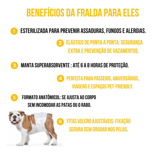 Seu pet é parte da família e merece estar ao seu lado em qualquer momento, sem que você precise se preocupar ou que ele faça suas necessidades fora do lugar. O Kit com 12 Fraldas Higiênicas Descartáveis para Cães machos garante higiene, conforto e liberdade, permitindo que sue amigo de 4 patas aproveite passeios, viagens e momentos especiais com segurança e bem-estar. Desenvolvidas com material esterilizado e anatômico, elas oferecem absorção eficiente, ajuste perfeito e proteção contra vazamentos, sendo ideais para passeios no shopping ou na casa de amigos e familiares. Apesar de este modelo ser específico para cachorros, também temos a versão para as cachorras, garantindo cuidado para todos os pets. Veja em “Mais anúncios do vendedor.” Benefícios da fralda para eles: • Formato anatômico e confortável: se ajusta ao corpo sem incomodar as patas ou o rabo • Manta superabsorvente com gel em flocos: até 6 a 8 horas de proteção, dependendo do fluxo • Fitas velcro ajustáveis: fixação segura sem grudar nos pelos • Elástico de ponta a ponta: segurança extra e prevenção de vazamentos • Higiene e proteção: esterilizada para prevenir assaduras, fungos e alergias • Prática e versátil: perfeita para passeios, aniversários, viagens e espaços pet-friendly Quando usar as fraldas: • Cães no cio • Pets idosos com incontinência urinária • Pós-operatório ou cuidados especiais • Para evitar xixi fora do lugar ou marcação de território • Passeios e eventos com seu pet Benefícios para a saúde e bem-estar do seu cachorrinho: • Previne assaduras e alergias • Mantém a higiene e limpeza do ambiente • Evita estresse do animal com restrições de movimento • Proporciona maior conforto em períodos delicados Tamanhos disponíveis: Tamanho P: 3 a 6 kg – Cintura até 40 cm Tamanho M: 6 a 13 kg – Cintura até 49 cm Tamanho G: 13 a 20 kg – Cintura até 58 cm Modo de usar: Encaixe a parte traseira do pet no orifício anatômico da fralda. Feche as extremidades sobre a cintura usando as fitas velcro ajustáveis. Verifique se está firme, mas confortável para o pet. Troque regularmente para manter higiene e bem-estar. A fralda higiênica é da marca Dog’s Care, referência em qualidade, conforto e proteção para pets. Garanta a sua na ImagineDrop e permita que você e seu pet aproveitem cada passeio e momento especial com praticidade e segurança.