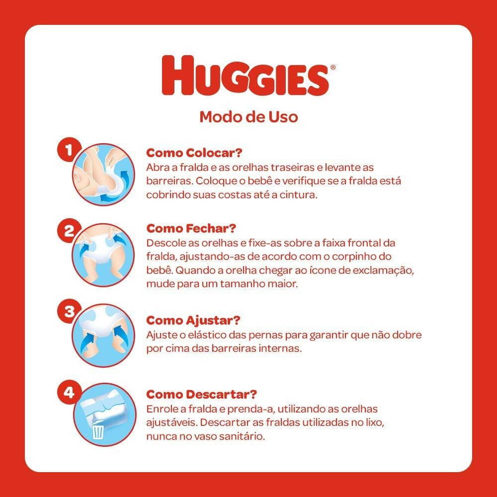 O que é As Fraldas Huggies Tripla Proteção contém a tecnologia TripleSec, que permite que a fralda fique mais seca, tenha maior absorção e um sistema melhor de anti-vazamento. A fralda possui também fechos macios com sistema abre e fecha e é dermatologicamente testada. Para que serve Sua Tripla Proteção garante que seu bebê fique sequinho por muito mais tempo, sem agredir a pele sensível dele. Conta com o fecho ajustável que abre e fecha quantas vezes forem necessárias, facilitando ajustar a fralda de forma confortável no corpinho do bebê. Modo de usar Levante as barreiras da fralda. Coloque o bebê sobre a fralda aberta. Descole os fechos ajustáveis e fixe-os sobre a faixa frontal da fralda. Ajuste de acordo com o corpinho do bebê.