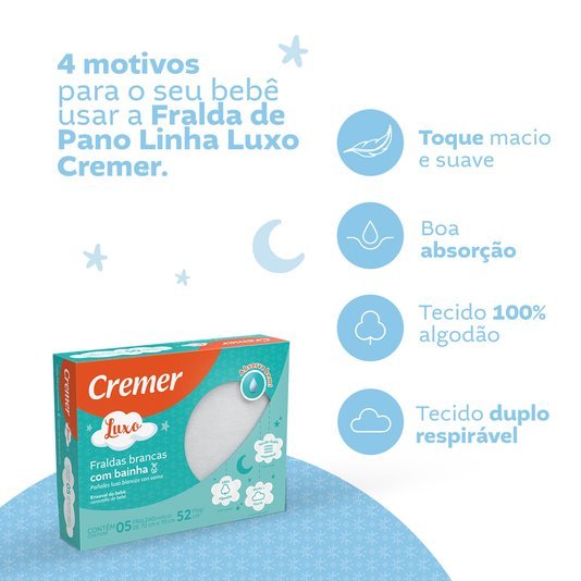 Com tecido 100% algodão tem um toque suave e macio e completa o enxoval do seu bebê. A linha Luxo da Cremer tem como principais ingredientes: cuidado, dedicação e muito carinho na criação e desenvolvimento de produtos para bebês. 52 fios/cm² 100% algodão Tecido duplo respirável Muito mais macio Absorve bem Com Bainha