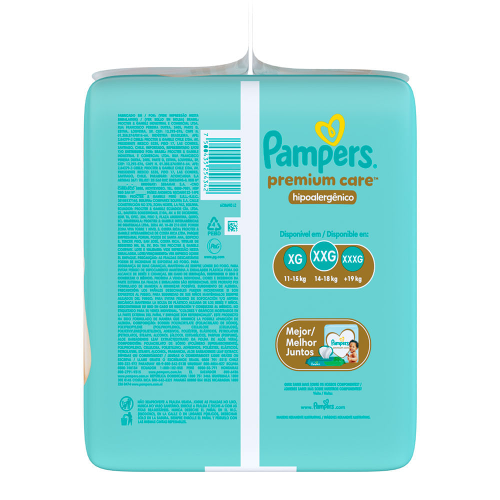 Pampers Premium Care XXG - Hipoalergênico Ofereça ao seu bebê o melhor cuidado com as fraldas Pampers Premium Care na categoria XXG! Com capacidade para crianças de 14 a 18 kg, essas fraldas foram esp
