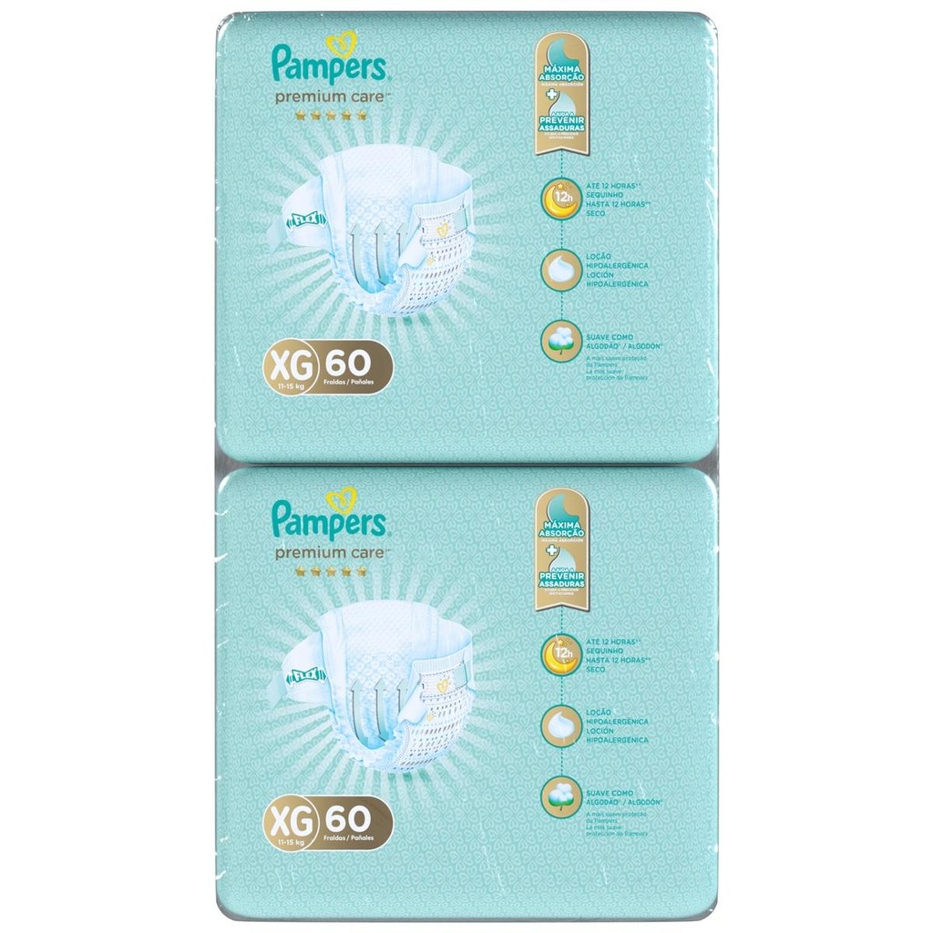 Conhece o kit exclusivo de fraldas de venda online Pampers Premium Care, que inclui 2 pacotes de 60 fraldas cada. Premium Care oferece o maior cuidado para a pele do seu bebê de Pampers! Graças a nossa exclusiva loção hipoalergênica que ajuda a prevenir assaduras e manter a pele do seu bebê saudável e protegida. Nossas fraldas são suaves como o algodão* e ultra respiráveis, proporcionando conforto e frescor ao seu bebê durante todo o dia. A Pampers Premium Care oferece uma camada de absorção que retém a umidade, mantendo a pele do bebê seca e protegida por até 12 horas. Com sua tecnologia inovadora, essas fraldas se ajustam perfeitamente ao corpo do seu bebê, garantindo um ajuste seguro e confortável. Experimente a Pampers Premium Care.*Não contém fibras de algodão*Suavidade sentida na camada externa da fralda • Máxima absorção de Pampers • Loção Hipoalergênica • Ultra respirável • Suave como algodão° • Ajuste cômodo e flexível: esticam e se ajustam aos movimentos do seu bebê • Barreiras anti-derrames • Novos desenhos para o dia e para a noite!