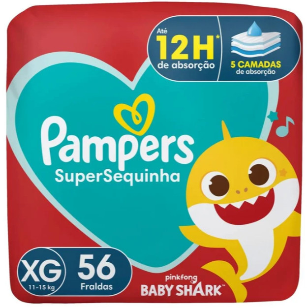 O que é a Fralda Pampers Super Sequinha XG? A Fralda Pampers Supersequinha XG é uma fralda descartável indicada para bebês com peso entre 11kg e 15kg. Desenvolvida para proporcionar conforto e proteção por até 12 horas, ajuda a manter o bebê seco durante toda a noite. Para que serve a Fralda Pampers Supersequinha XG? A Fralda Pampers Supersequinha XG serve para absorver e reter o xixi do bebê, mantendo a pele protegida e seca. É ideal para uso prolongado, inclusive durante a noite, oferecendo até 12 horas de proteção contínua. Composição da Fralda Pampers Supersequinha XGPolímeros superabsorventesCamada externa macia e respirávelFitas reajustáveisBarreiras antivazamentoCamada extra secaBenefícios da Fralda Pampers Supersequinha XGAté 12 horas de proteção contra vazamentosFormato anatômico para melhor ajuste ao corpo do bebêCamada extra de absorção que ajuda a manter a pele secaFitas reajustáveis que facilitam a colocaçãoToque macio e confortávelModo de uso da Fralda Pampers Supersequinha XG Coloque o bebê sobre a fralda aberta. Desgrude as fitas e puxe-as para ajustar ao corpo do bebê. Fixe as fitas na faixa decorada da parte frontal da fralda. Advertências ao uso da Fralda Pampers Supersequinha XGNão expor a fralda ao fogo, pois o material pode se incendiar.Mantenha a embalagem plástica fora do alcance de bebês e crianças para evitar risco de sufocamento.Produto de uso único e descartável.Proibida a venda individual.Cores e desenhos da fralda e embalagem são meramente ilustrativos.Tamanho do produto Contém 56 unidades. Indicado para bebês com peso entre 11kg e 15kg.