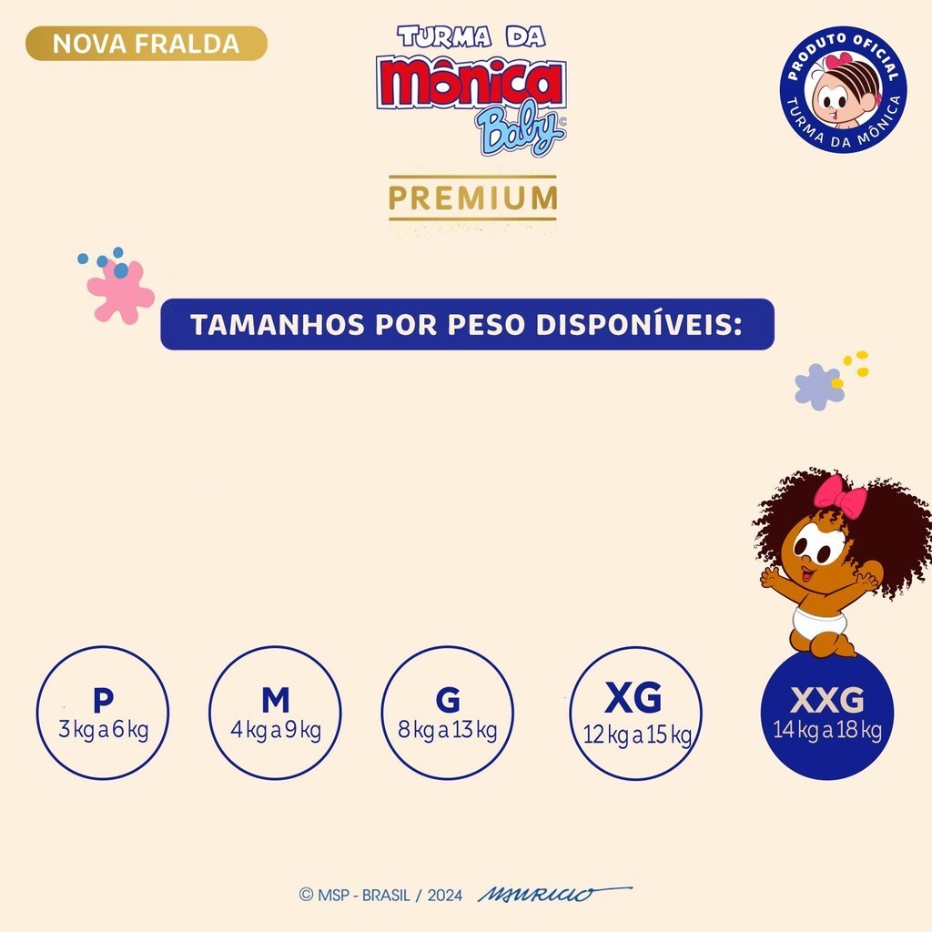 A nova fralda Turma da Mônica Baby Premium chegou, com até 12 horas de proteção e um toque macio e suave como algodão, garantindo conforto para o seu bebê. Suas abas elásticas proporcionam um melhor ajuste no corpinho, além de ter barreiras antivazamento que oferecem proteção durante o dia e a noite.Uma escolha segura e confortável para um carrinho especial a cada troca.