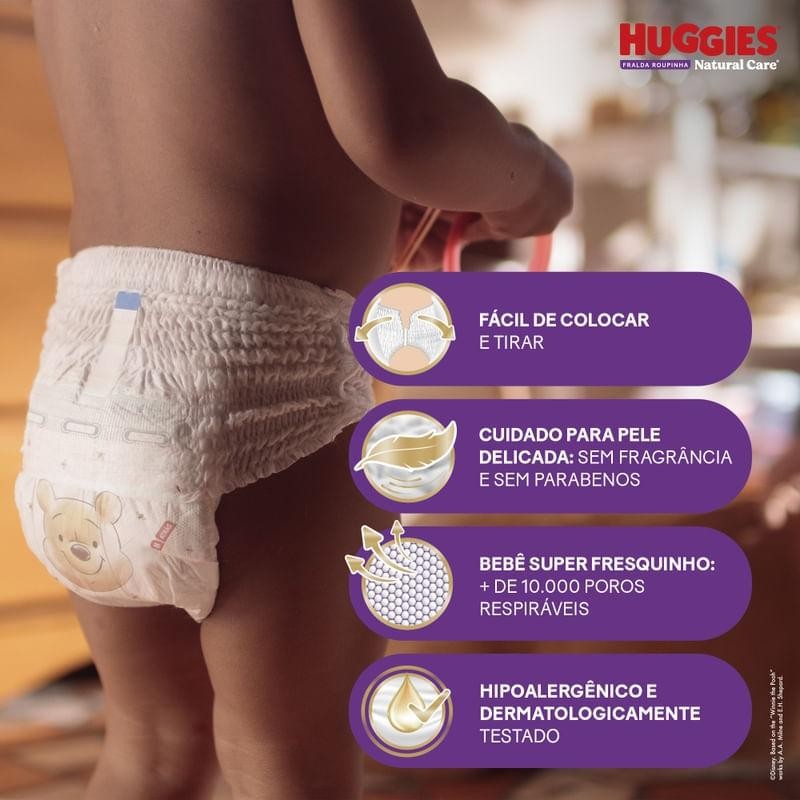 A Huggies Fralda Roupinha Natural Care é a escolha ideal para a proteção máxima da pele do seu bebê. Com um cuidado superior para a pele delicada, proporciona um toque suave e delicado como algodão. Sua tecnologia avançada garante a sensação de sempre sequinho. Hipoalergênica e sem parabenos, a Huggies Natural Care foi pensada para proteger a pele do seu bebê contra assaduras por até 12 horas. Possui uma tecnologia especialmente desenvolvida para a melhor absorção de cocô líquido, sem vazamentos. Além disso, os elásticos na cintura oferecem mais liberdade com a Tecnologia Xtra-Flex, canais que se adaptam aos movimentos do bebê. Com distribuição mais rápida e uniforme em comparação com fraldas Huggies sem a tecnologia Xtra-Flex, o sistema de ajuste flexível inclui cós elástico, barras e laterais elásticas, permitindo um ajuste adaptável à parte superior do corpo, junto com canais anatômicos exclusivos que se adaptam aos movimentos do bebê.
