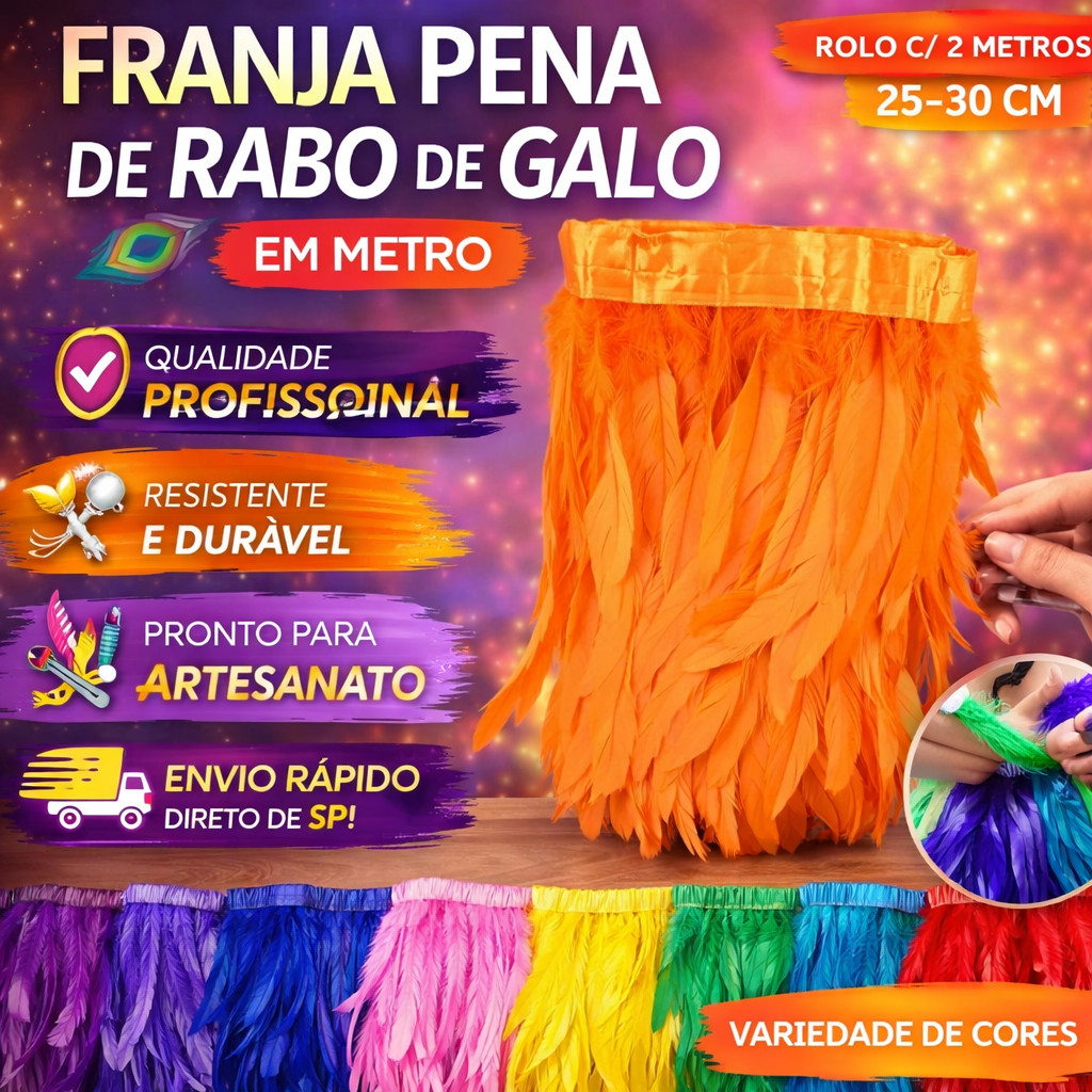 A franja de penas de rabo de galo é perfeita para dar volume, movimento e elegância em diversos tipos de trabalhos artesanais e decorativos. Muito utilizada em fantasias de carnaval, moda, decoração de eventos e artesanato, essa franja traz um acabamento sofisticado e cheio de estilo. Ideal para quem busca um material macio, leve e de excelente qualidade. ✔ Fantasias de Carnaval✔ Moda e customização de roupas✔ Decoração de festas e eventos✔ Artesanato✔ Filtros dos sonhos✔ Petecas✔ Brinquedos para pets✔ Arranjos decorativos Produto: Franja de Pena Rabo de GaloMaterial: Pena naturalComprimento da Pena: aproximadamente 25 – 30 cmQuantidade: 2 metros por roloCores: diversas cores disponíveis ✔ Penas macias e leves✔ Ótimo acabamento✔ Ideal para fantasias e artesanato✔ Fácil aplicação em diversos trabalhos ? Envio direto de São Paulo? Produto à pronta entrega? Envio rápido? Nota fiscal inclusa Por se tratar de um produto natural, pode haver pequenas variações de cor ou tamanho. As cores também podem variar de acordo com configuração de tela ou monitor.
