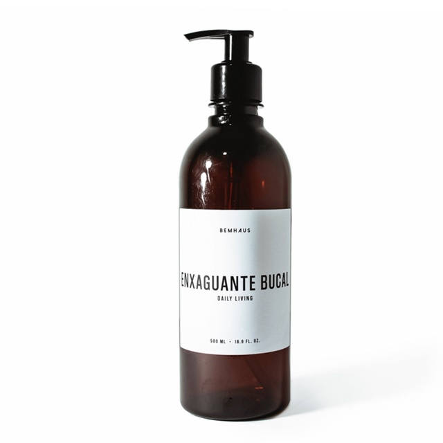 Frasco âmbar com rótulo branco "Enxaguante Bucal" 500ml + 1 válvula pump preta. Dimensão do frasco: 22,5 X 6,5 cm Capacidade 500 ml Rótulo com acabamento fosco que suporta contato com a água Material: Plástico Cor: Ambar Frasco vazio Ficou com alguma dúvida? Fale com a gente pelo chat. Bemhaus 🖤