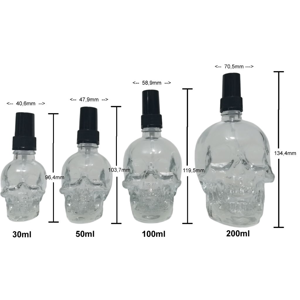 FRASCO VIDRO CAVEIRA PARA AROMATIZADOR DE AMBIENTE SPRAY E VARETAS Frasco de vidro Caveira de 170ML - 100ML - 50ml e 30ml para perfumes recarregável com válvula spray luxo Conjunto Formado por: 1 Frasco 1 Válvula com tampa Ideal para perfumes, colônias, home spray, body splash e outros - Frasco Material: vidro Cor: Transparente Terminação: Rosca 18 Capacidade: 170ml, 100ml, 50ml e 30 ml