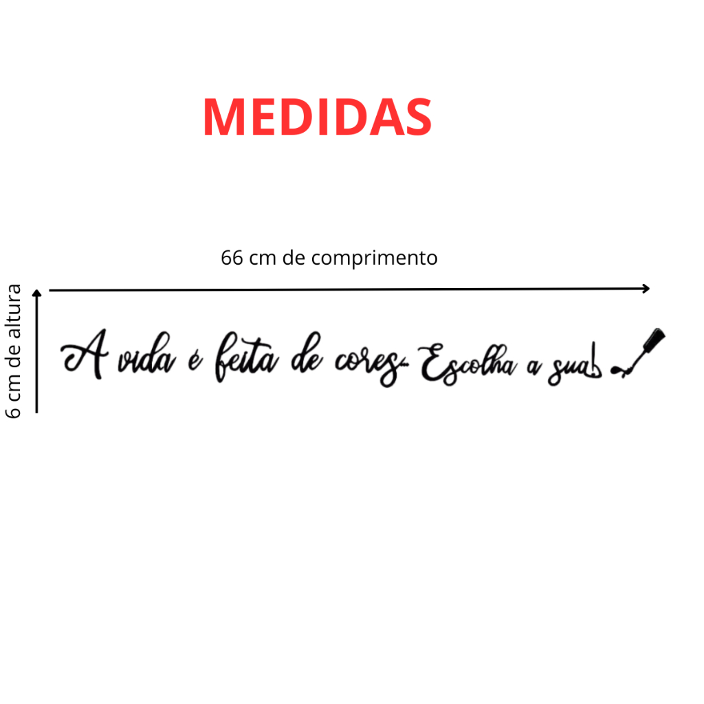 Somos a Liquida Mdf, especialista em decoração e comunicação Visual. Aqui você encontra produtos criativos para decorar qualquer ambiente,deixando sua casa mais aconchegante e investindo pouco. DETALHES: - Matéria prima: Mdf ecológico - Cor:Tinta Preto Premium - Espessura: 3mm ITENS INCLUSOS: - Frase decorativa para salão de beleza: A vida é feita de cores, escolha a sua ( 6 cm de altura x 80 cm de comprimento ) - Fita dupla face 3m DICAS: - Para limpeza utilize apenas um pano seco, não utilize produtos químicos, para garantir a durabilidade. - É indicado aplicar as peças em parede que sejam lisas.
