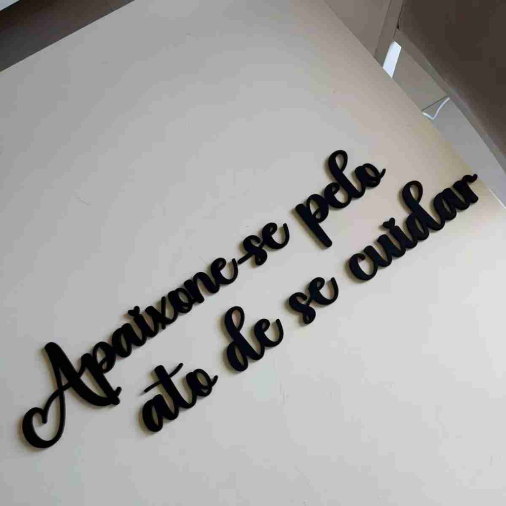 Frase Decorativa Apaixone-se pelo ato de se cuidar. Indicado para decoração de ambientes internos, como salão de beleza, spa, studio, depilação, etc. Material: MDF 3MM Cor: PRETO Medida: 11 CM DE ALTURA X 115 CM DE LARGURA (frase em linha reta!) Acompanha Fita Dupla Face, a mesma já vai colada na parte de trás da peça para facilitar sua aplicação na parede. (aconselhamos parede lisa para melhor aderência da peças na parede). Feito em uma máquina laser, corte preciso e excelente acabamento da peça. Temos outros Apliques, Frases, Letreiros (Quadros Vazados) em MDF 3MM, fique a vontade em nossa loja. Boas Compras! Se houver dúvidas ou interesse em outros produtos, estaremos a disposição pelo chat.
