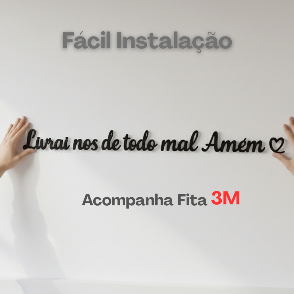 ✨ Frase Decorativa em MDF 6×60 cm – “Livrai Nos de Todo Mal Amém ♡” – MDF Preto Fosco 3mm Transforme qualquer ambiente com esta frase decorativa feita em MDF preto fosco 3mm, recortada a laser com acabamento premium. Perfeita para sala, quarto, corredor, escritório, cantinho da fé ou área gourmet, trazendo proteção, beleza e estilo moderno à sua casa. 📏 MEDIDAS DO PRODUTO Comprimento: 60 cm Altura: 6 cm Espessura: 3 mm Material: MDF Preto Fosco Premium Tecnologia: Corte a laser de alta precisão Instalação: Fita dupla face 3M inclusa, super fácil de aplicar 🔥 BENEFÍCIOS ✔ Design moderno e elegante ✔ Não desbota, acabamento fosco premium ✔ Recorte impecável (laser de precisão) ✔ Combina com qualquer decoração ✔ Produto artesanal de alta qualidade ✔ Leve, prático e rápido de instalar 🏠 ONDE USAR Sala de estar, Quarto, Escritório / Home Office, Entrada da casa, Cantinho de oração, Corredores e Hall de Entrada , Ambientes minimalistas e Modernos 🎁 ÓTIMO PARA PRESENTEAR Surpreenda amigos e familiares com uma frase de fé que traz proteção e boas energias ao lar.