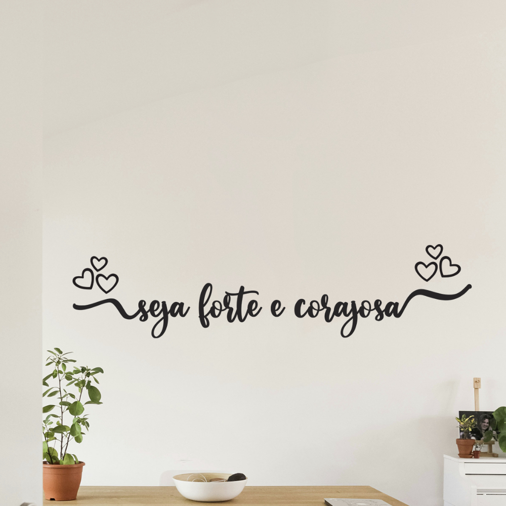 O modelo Quadro Decorativo Frase Seja Forte e Corajosa é produzido em MDF com espessura de 3mm envelopado na cor Preto Fosco. Com ele, você consegue decorar diversos ambientes de sua casa, sendo sala, quarto, ou onde preferir, tornando seu ambiente ainda mais lindo e completo. Além de possuir um método rápido, fácil e simples de aplicação, sem ser necessário fazer sujeira ou furar as paredes. MEDIDA: FRASE COMPLETA: 72cm x 17cm (LARGURA x ALTURA) INSTALAÇÃO: O produto ser fixado com uma fita dupla face (3M) que ser enviada junto ao seu produto, posicionada no mesmo. O produto s deve ser aplicado em superfícies que sejam totalmente lisas e foscas, sem nenhum indício de textura, irregularidades ou brilho. Caso queira aplicar em superfícies com textura ou brilho, será necessário utilizar pregos pequenos para pendurar o produto. PRODUTO: - MATERIAL: MDF Premium. - ESPESSURA: 3mm - ACABAMENTO: Fosco. - DURABILIDADE: 5 anos ou mais. - FUNDO: Produto vazado, não possui fundo. Produzidos com corte à laser, possui as bordas com acabamento perfeito. LIMPEZA: A limpeza pode ser realizada com um pano úmido. Não recomendamos que utilize produtos abrasivos. EMBALAGEM: Produto enviado com embalagem resistente para garantir que chegue em segurança e em perfeito estado até você. Caso ainda sim tenha alguma dúvida, estamos à disposição para lhe atender através do CHAT.