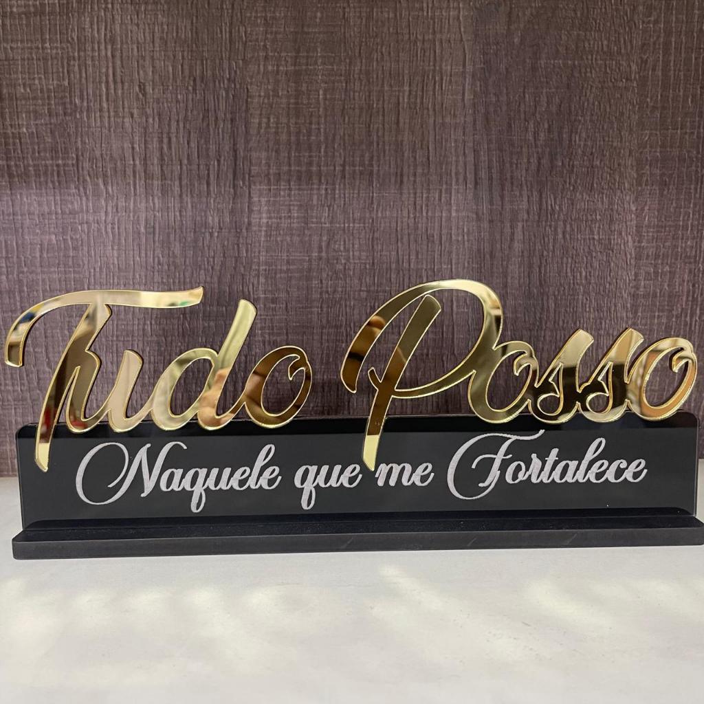 Frase Tudo Posso Naquele Que me Fortalece em Acrílico Espelhado 25x10cm Decoração