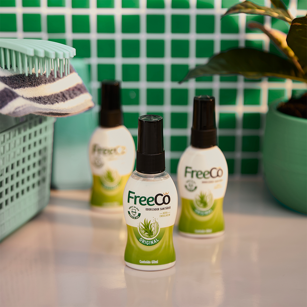 kit com 2 Unidades de FreeCô Original Capim-Limão de 60 ml. Ideal para deixar em banheiros e lavabos. Na sua casa ou no trabalho. - FreeCô é 1º bloqueador de odores sanitários do Brasil, eliminando de forma definitiva o mau cheiro do nº2 e também o constrangimento em utilizar o banheiro. - FreeCô veio para acabar com cheirão e com o medo do Nº 2. Afinal de contas, é pioneiro no seu segmento. - Não é aerossol, é um produto natural feito com princípios ativos de óleos essenciais fitoterápicos, portanto, não faz mal à saúde nem ao meio ambiente. - Portátil, pode ser levado na bolsa, no bolso ou onde você quiser. O segredo do sucesso é que ele elimina de forma definitiva o constrangimento em utilizar o banheiro. Sua apresentação em frascos com 60 ml é ideal para levar no bolso, na bolsa, nécessaire, pasta ou mochila. FreeCô chegou para eliminar um dos principais motivos de bullying, constrangimentos e humilhações no trabalho, na escola, em casa, nos relacionamentos afetivos ou entre os amigos. FreeCô bloqueia o cheiro do sanitário quando utilizado de forma correta. Mas como funciona? FreeCô cria uma capa na superfície da água que neutraliza o mau cheiro antes mesmo de ser percebido. INSTRUÇÕES DE USO: - Posicione o frasco na altura da tampa do sanitário com o borrifador voltado para a água. - Borrife 5 vezes para criar uma barreira protetora de óleos naturais. - Desfrute do aroma agradável do FreeCô enquanto os odores indesejados desaparecem. Saiba como NÃO usar FreeCô: - Não usar FreeCô depois de fazer o Nº 2 - Não usar FreeCô borrifando no ar - Não usar FreeCô de qualquer outra forma que não seja na água do vaso sanitário BENEFÍCIOS - Tecnologia Avançada: Fórmula cientificamente desenvolvida para neutralizar odores antes mesmo que eles se espalhem pelo ar. - Fácil de Usar: Com instruções simples, basta borrifar 5 vezes o FreeCô na água antes de usar o vaso, criando uma barreira protetora natural. - Portátil: O frasco compacto de 60 ml é conveniente para transportar e manter em qualquer banheiro. - Econômico: Com apenas algumas borrifadas, o FreeCô oferece resultados poderosos, tornando-o econômico e de longa duração, até 100 usos (frasco de 60 mL). - Bem-Estar Garantido: Livre-se das preocupações com odores constrangedores e desfrute de um banheiro sempre fresco e agradável. FreeCô possui o selo vegano da Sociedade Vegetariana Brasileira após passar por todas as etapas que comprovam que o produto não possui ingredientes de origem animal e muito menos realiza teste em animais. Validade de 36 meses após a fabricação, todos os nossos frascos foram produzidos recentemente. Experimente a inovação em bloqueio de odores com o Desodorizador Sanitário FreeCô. Garanta frescor e conforto para seu banheiro com a refrescante fragrância de Lavanda. Borrife, use e sinta a diferença!